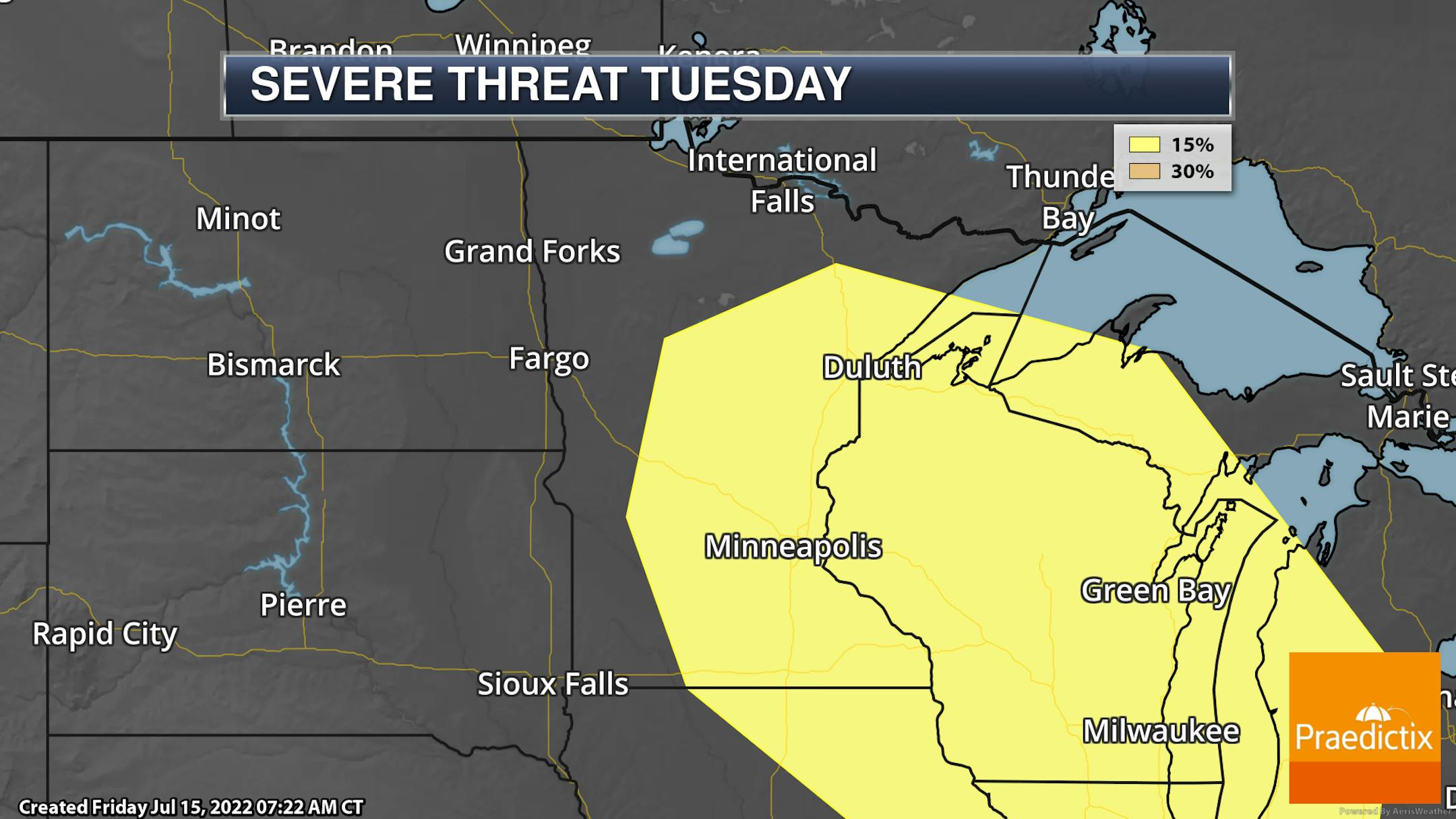 A few of the storms late Tuesday into Tuesday night could be on the strong side, with the equivalent of a Slight Risk (threat level 2 of 5) in place. Damaging winds will be the main threat at this time but stay tuned for the latest.