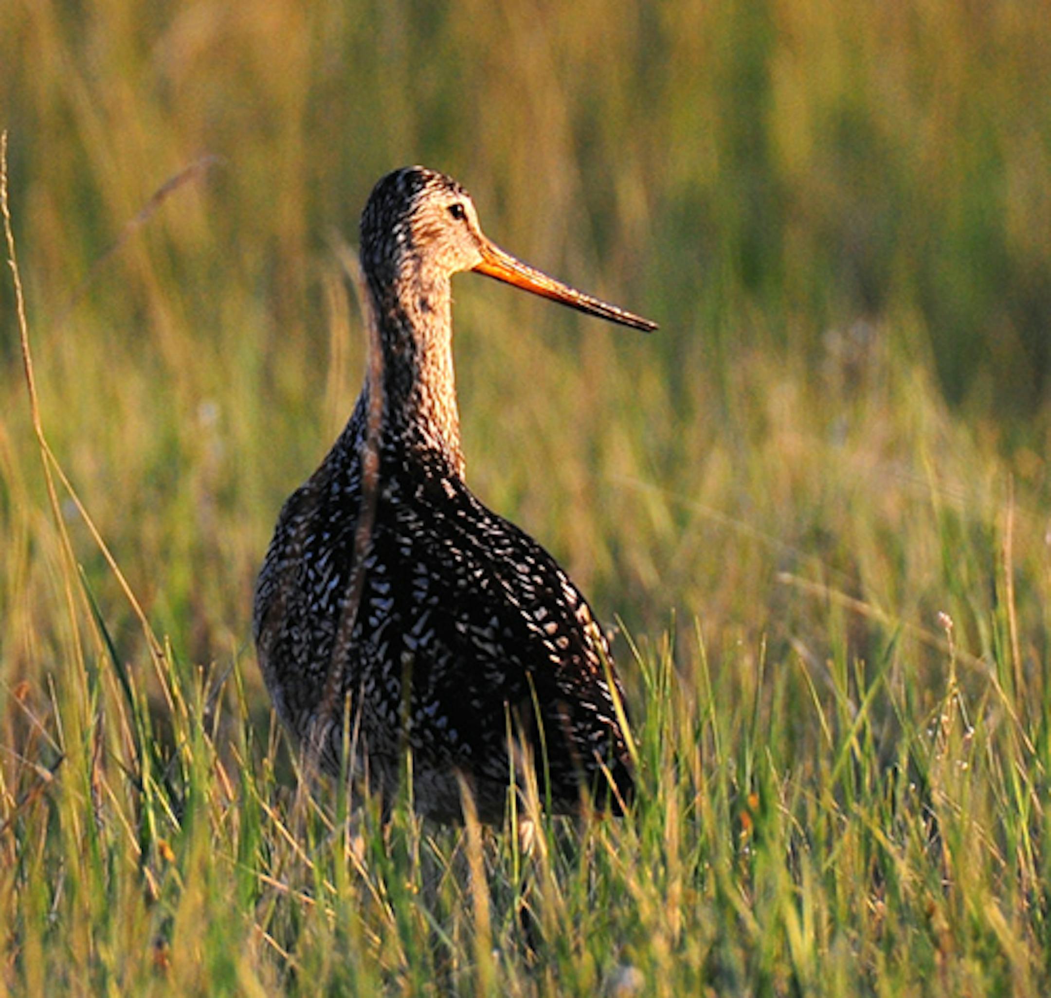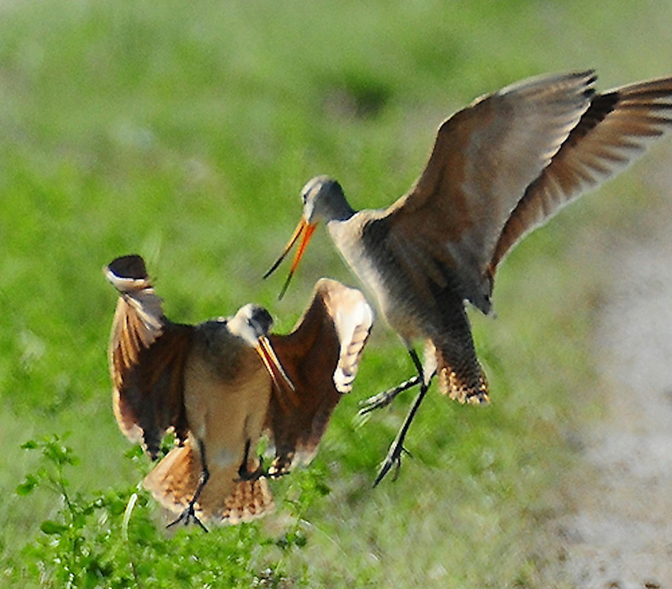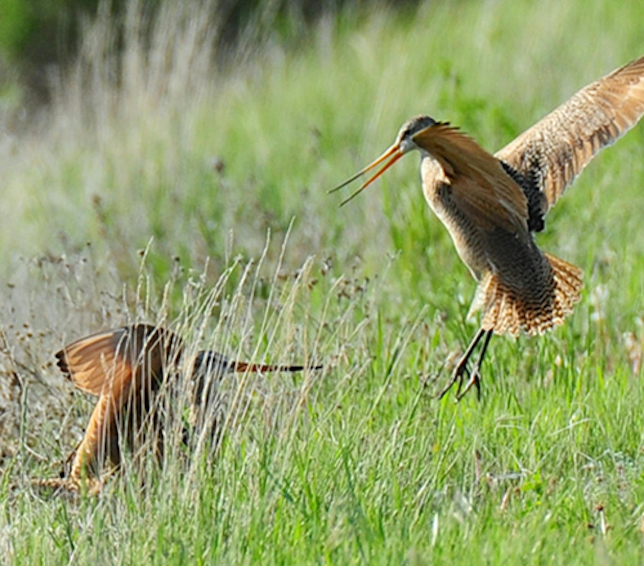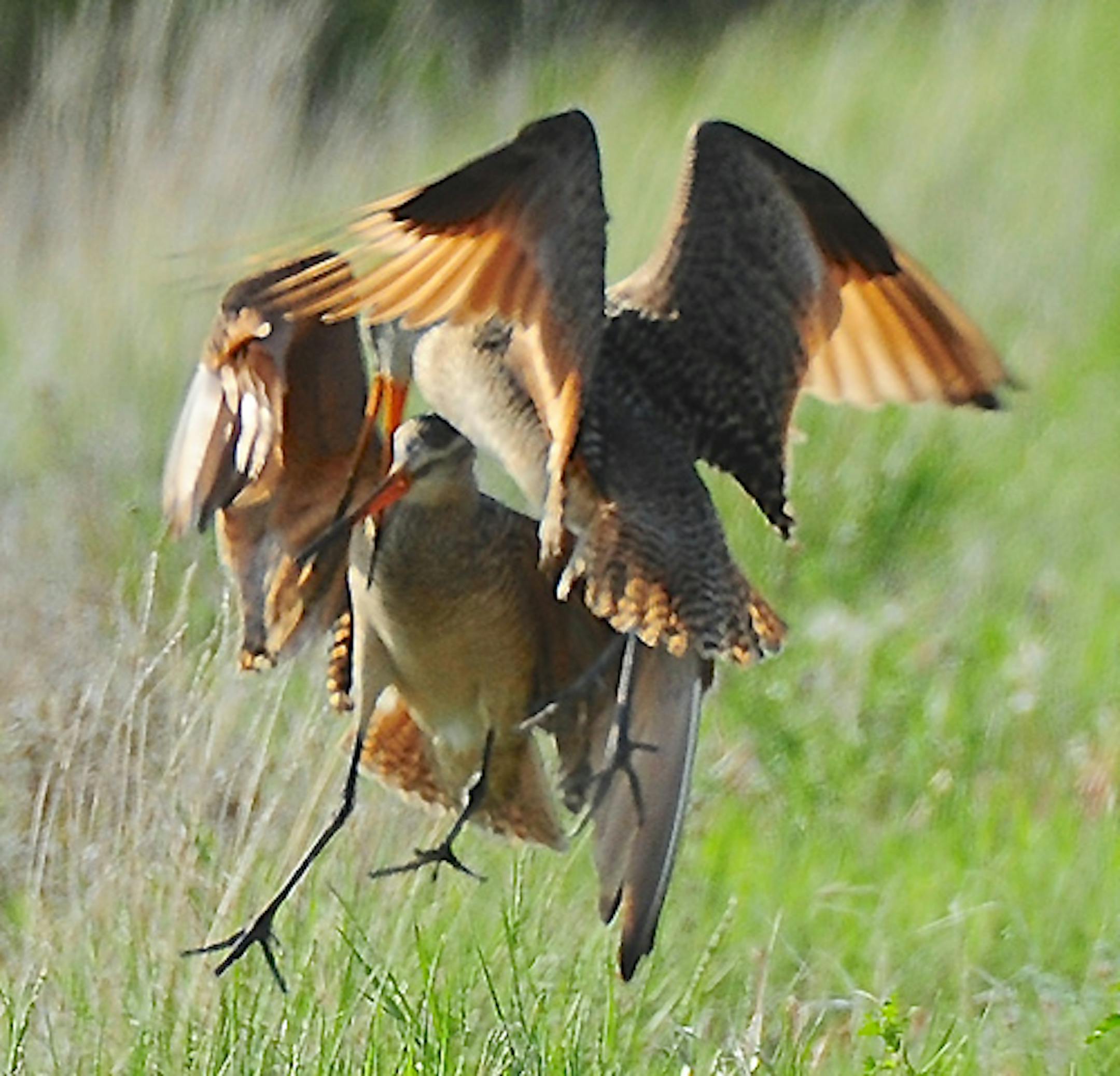 Marbled Godwits are migrant grassland nesters with Minnesota as the eastern edge of their U.S. breeding territory. They are more readily found in North Dakota and north-eastern Montana. The photos were taken in Montana in mid-May. The birds were engaged in a territorial battle that a went on for about 10 minutes. This was mostl any airborne battle with brief quiet periods for, I assume, rest. It was a vigorous fight. Most of the species' North American territory is in Manitoba, Alberta, and Saskatchewan, centered in Alberta. Minnesota has had breeders in decades past, in a one-county swath stretching from the beginning of the Minnesota River north to our border with Canada. The presence of grassland is the requirement and problem. Wildlife Management Areas and Waterfowl Production Areas are good places to look for Godwits, particularly in spring migration — late April to late May. Look for ponds and lakes with muddy edges. The birds are gone from the state by late July. I took the photos at Bowdoin National Wildlife Refuge, seven miles east of Malta, Montana. The refuge is a superb place for birdwatching and bird photography of waterfowl, wetland, and grassland species, the single best national refuge I have visited for those birds.