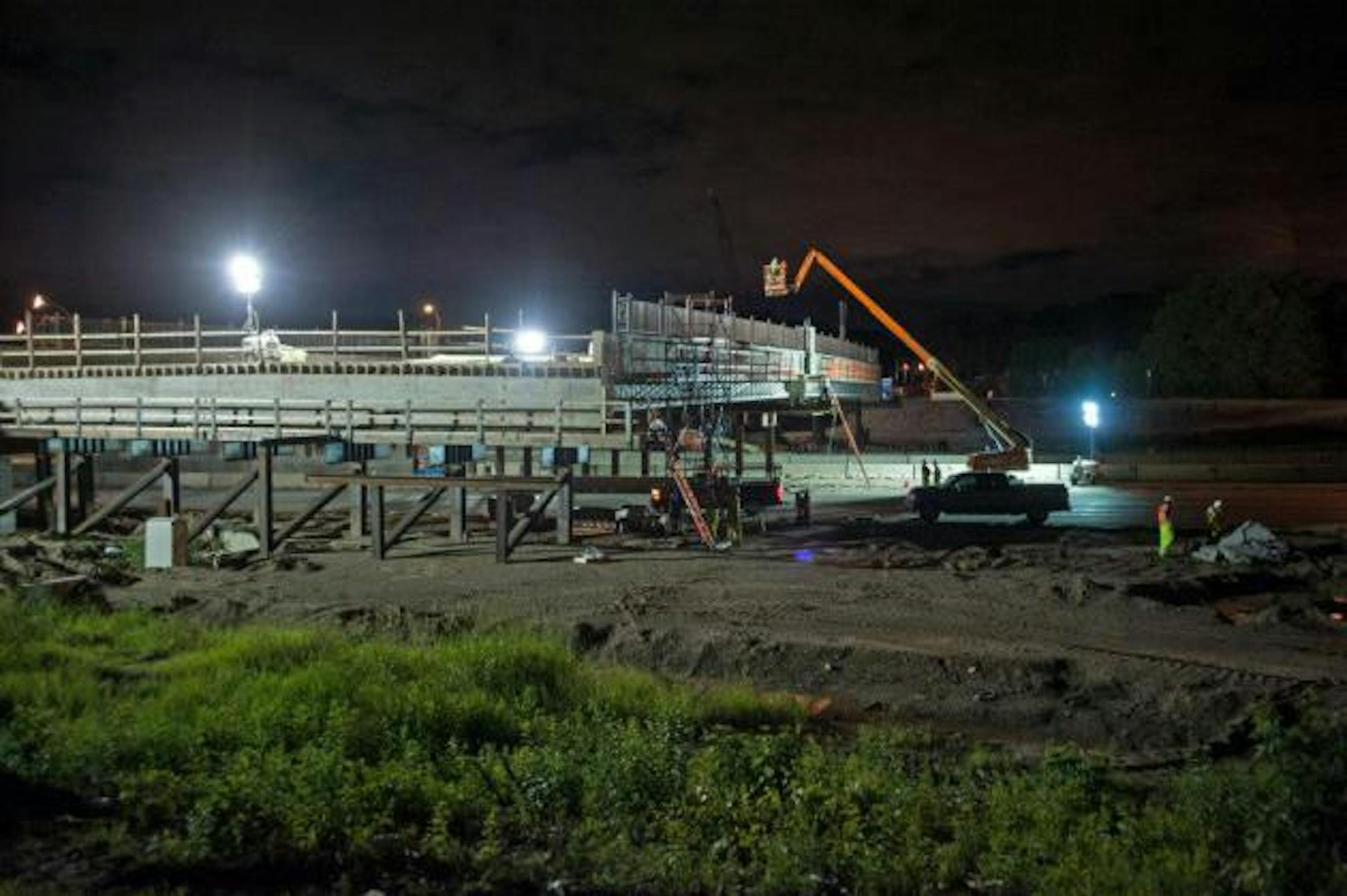 The new 3.5 million-pound deck and beams was built on a temporary structure immediately north of the where the old bridge was. MnDOT is using hydraulic jacks to push the new bridge onto the newly constructed new piers and abutments.