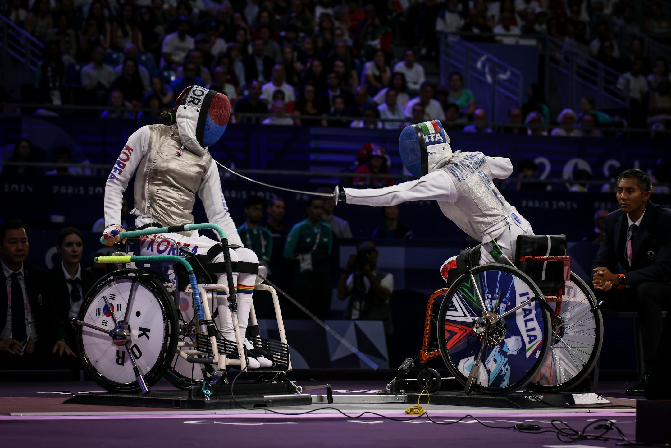 But Vio screamed with delight after beating Cho Eun Hye of South Korea 15-2 in the bout for bronze. She stood on chairs using her prosthetic legs to celebrate with Italian flag-waving supporters in the stands. Her fans had sung ''We love you Bebe'' at the Grand Palais as she surged into a comfortable lead.