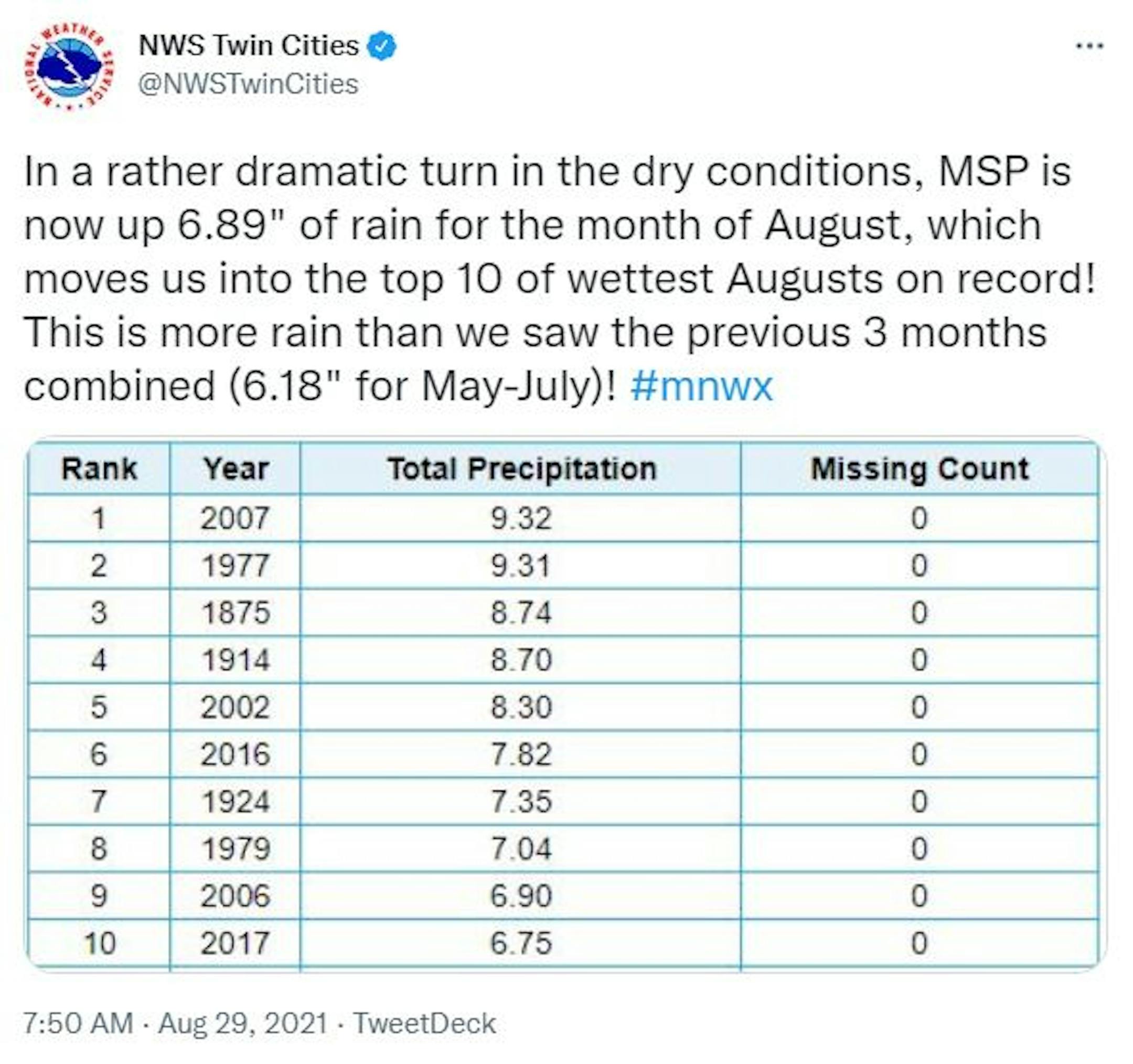 Through August 29th, the MSP Airport has received 6.89", which brings us to the 10th wettest August on record! Interestingly, we've seen more rainfall through the first 29 days of August than we did from May 1st - July 31st (6.18").Our wettest August on record was 9.32" set in 2007.