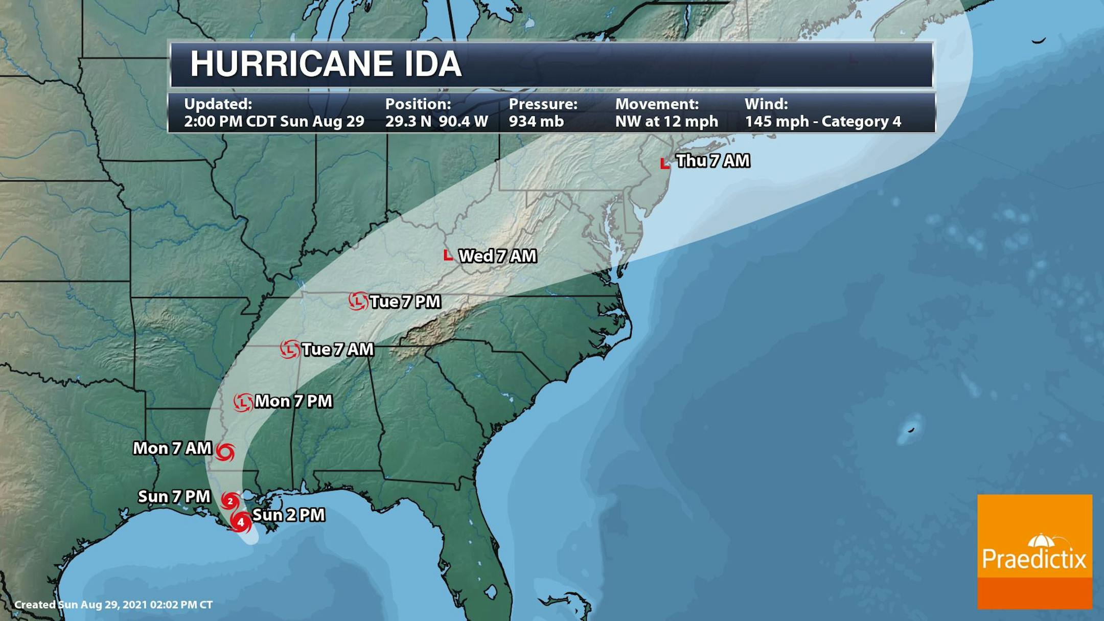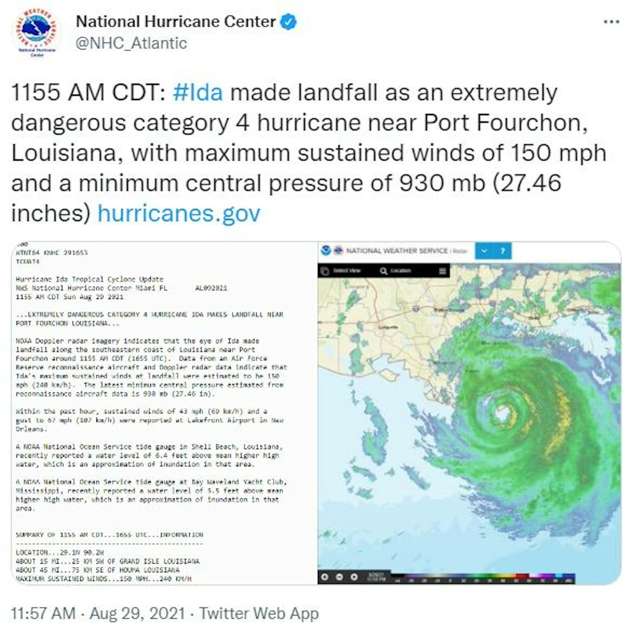 At 11:55AM on Sunday, August 29th, Hurricane Ida made landfall near Port Fourchon in southeastern Louisiana as a major category 4 hurricane with sustained winds of 150mph. The central pressure of the storm was 930mb, which is the lowest pressure ever recorded for a landfalling hurricane in the state of Louisiana. This is also the 3rd hurricane on record (since 1851) to have winds 150 sustained winds during a Louisiana landfall. The 2 other storms were the Last Island Hurricane of 1856 and Laura in 2020. Also note that this is the first time that two Category 4 hurricanes have made landfall in the state of Louisiana in back to back years. Category 4 Hurricane Laura in 2020 with 150mph winds and Category 4 Hurricane Ida in 2021 with 150mph winds.