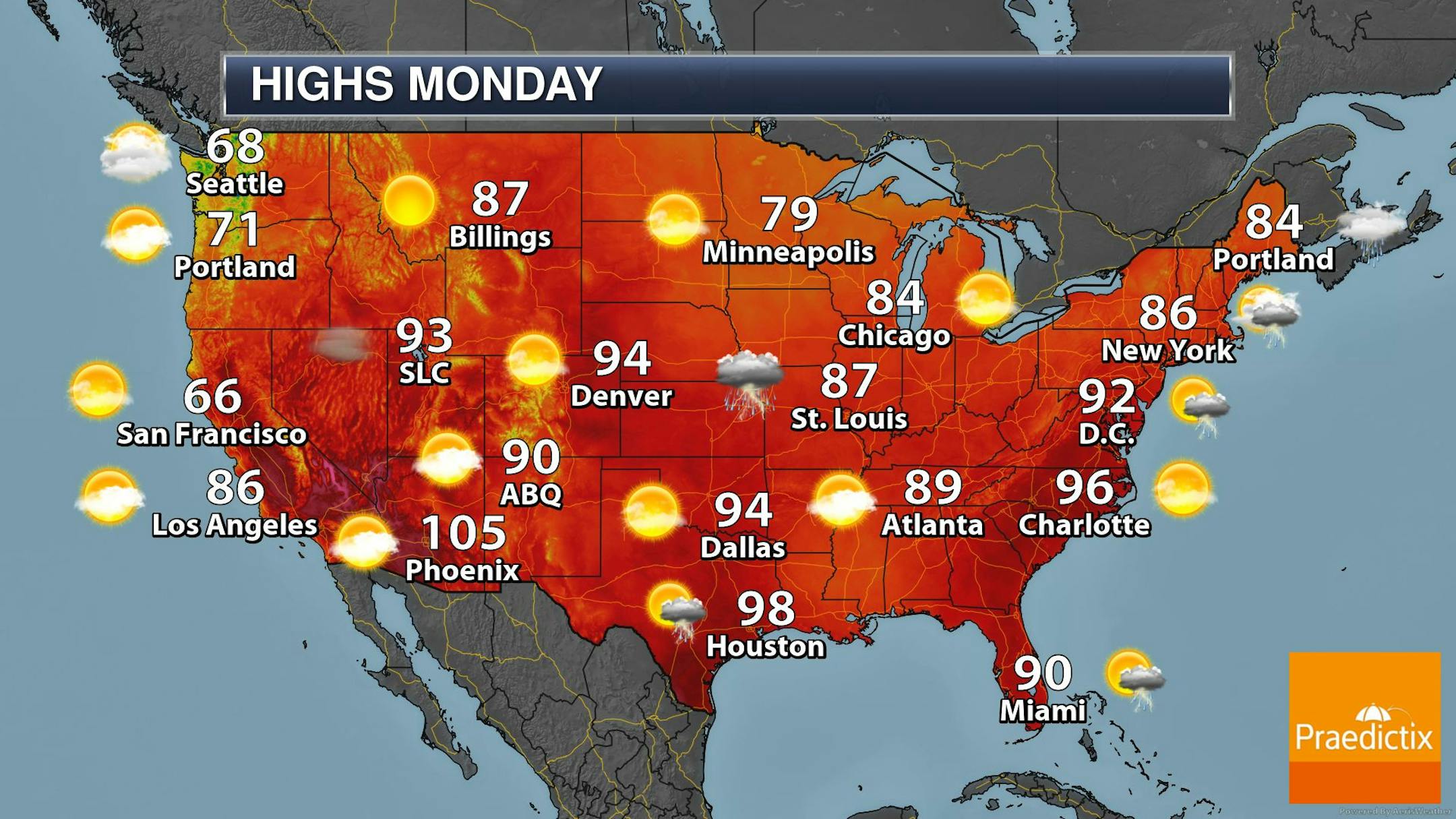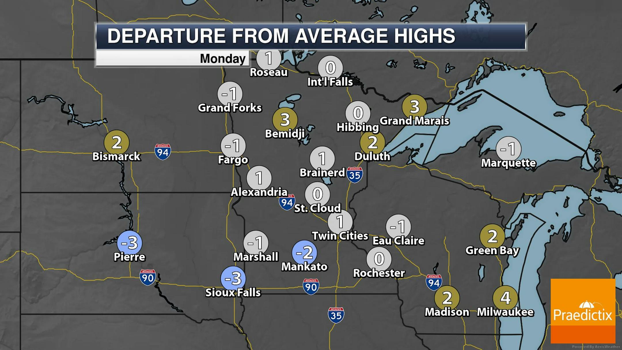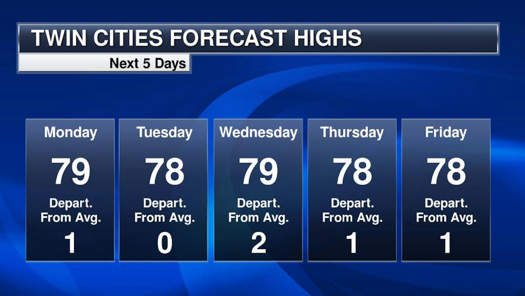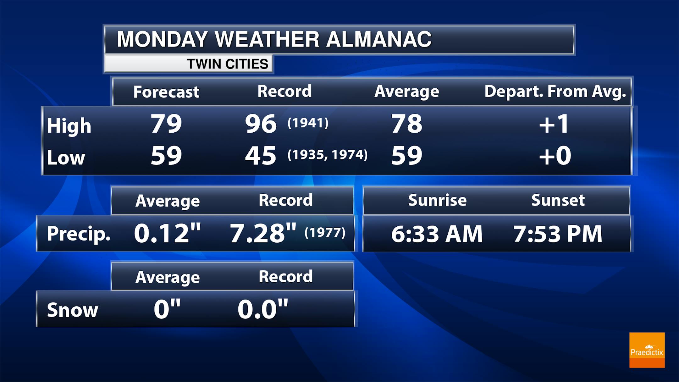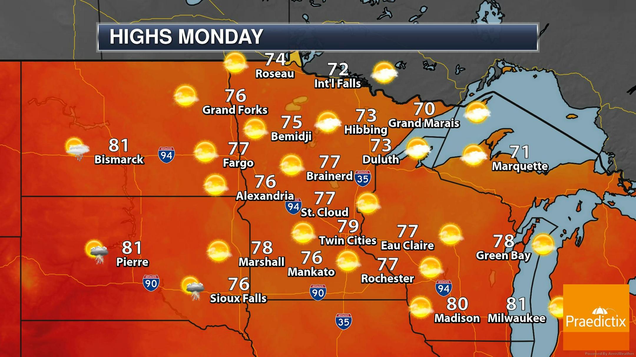 The weather outlook for the Twin Cities on Monday, August 30th looks like another nice day with mild sunshine. Temps will warm into the upper 70s to near 80F, which will be pretty close to if not slightly above average for the end of August.