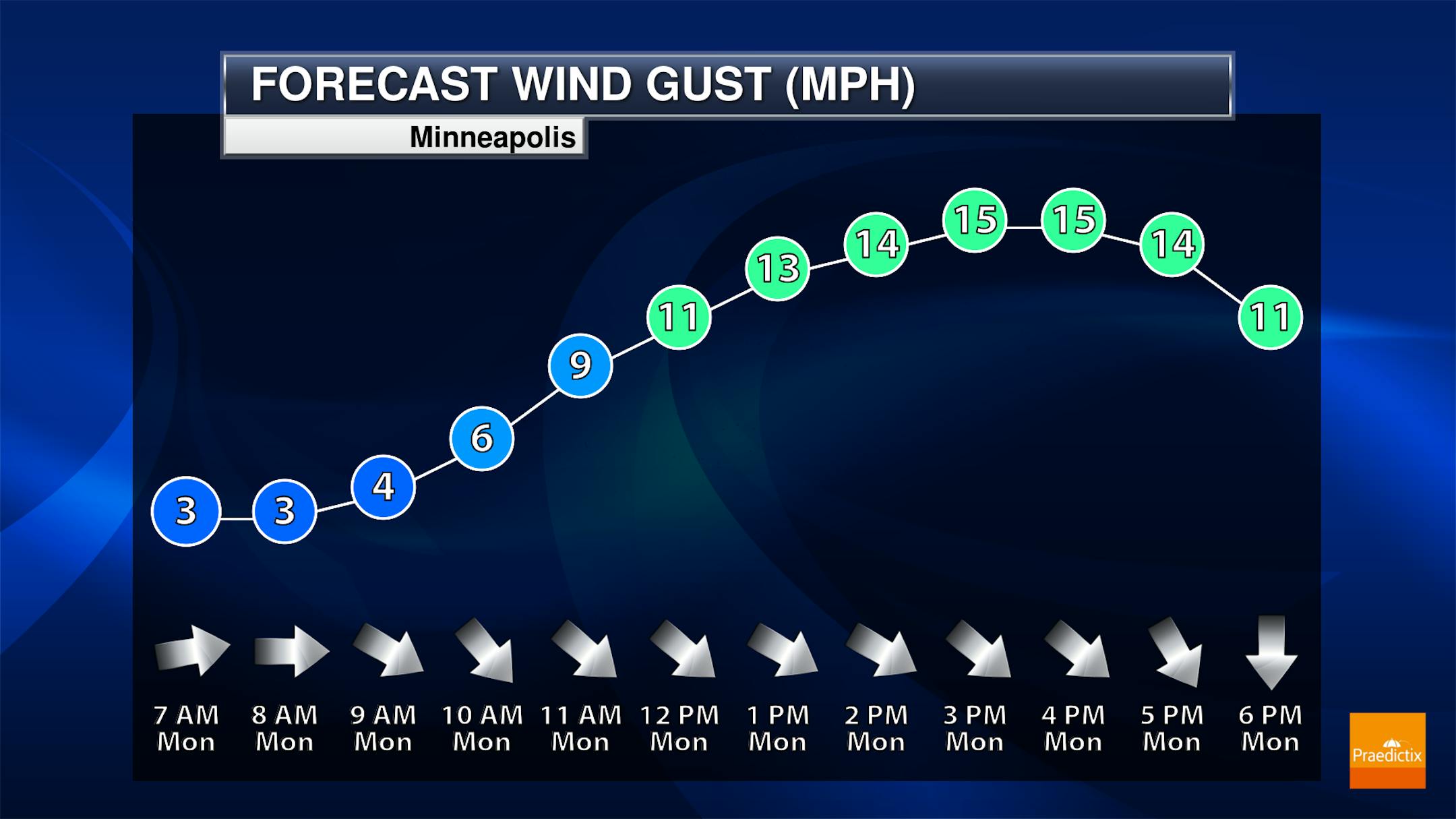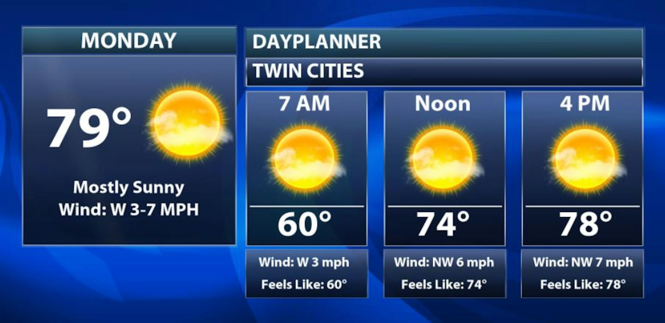 The meteograms for Minneapolis on Monday shows temps warming from near 60F in the morning to the mid to upper 70s by the afternoon. Skies will be sunny for much of the day with WNW winds at 10mph-15mph.