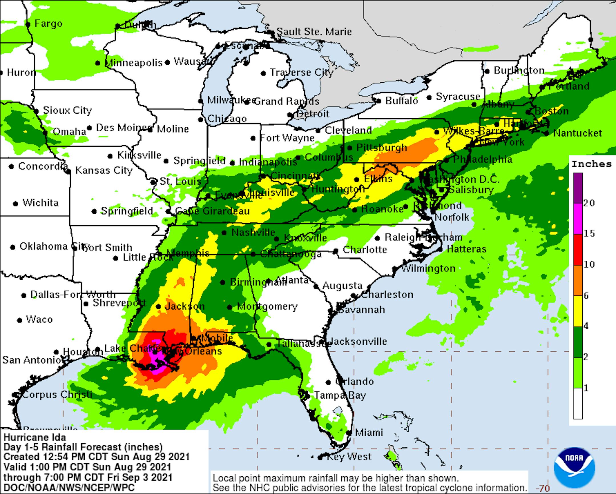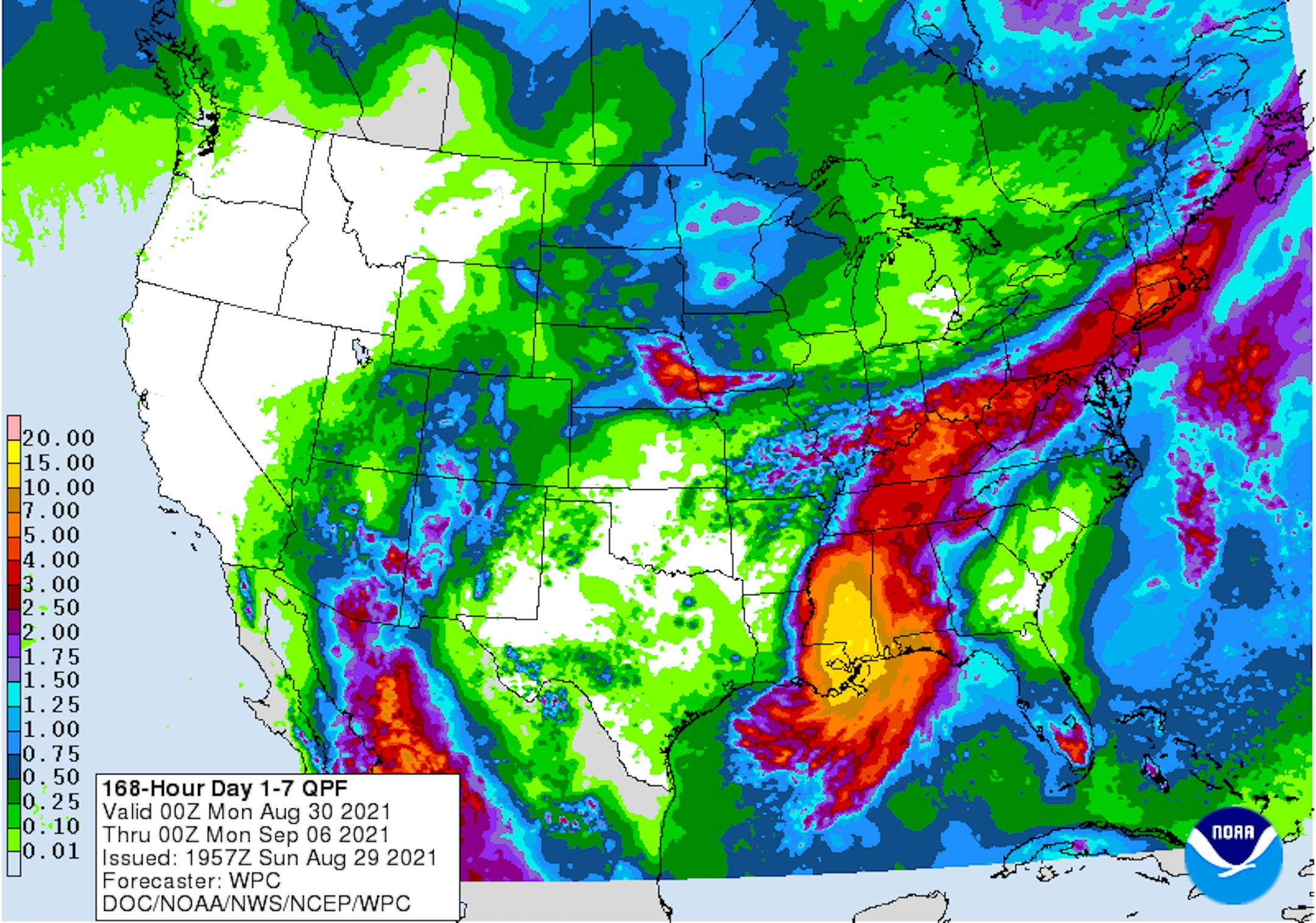 Rainfall amounts will still be heavy across the Southern US, but as the speed of Ida quickens, rainfall amounts should lessen to the northeast. However, there will be some appreciative totals with some 4" to 6" tallies possible with areas of flooding.