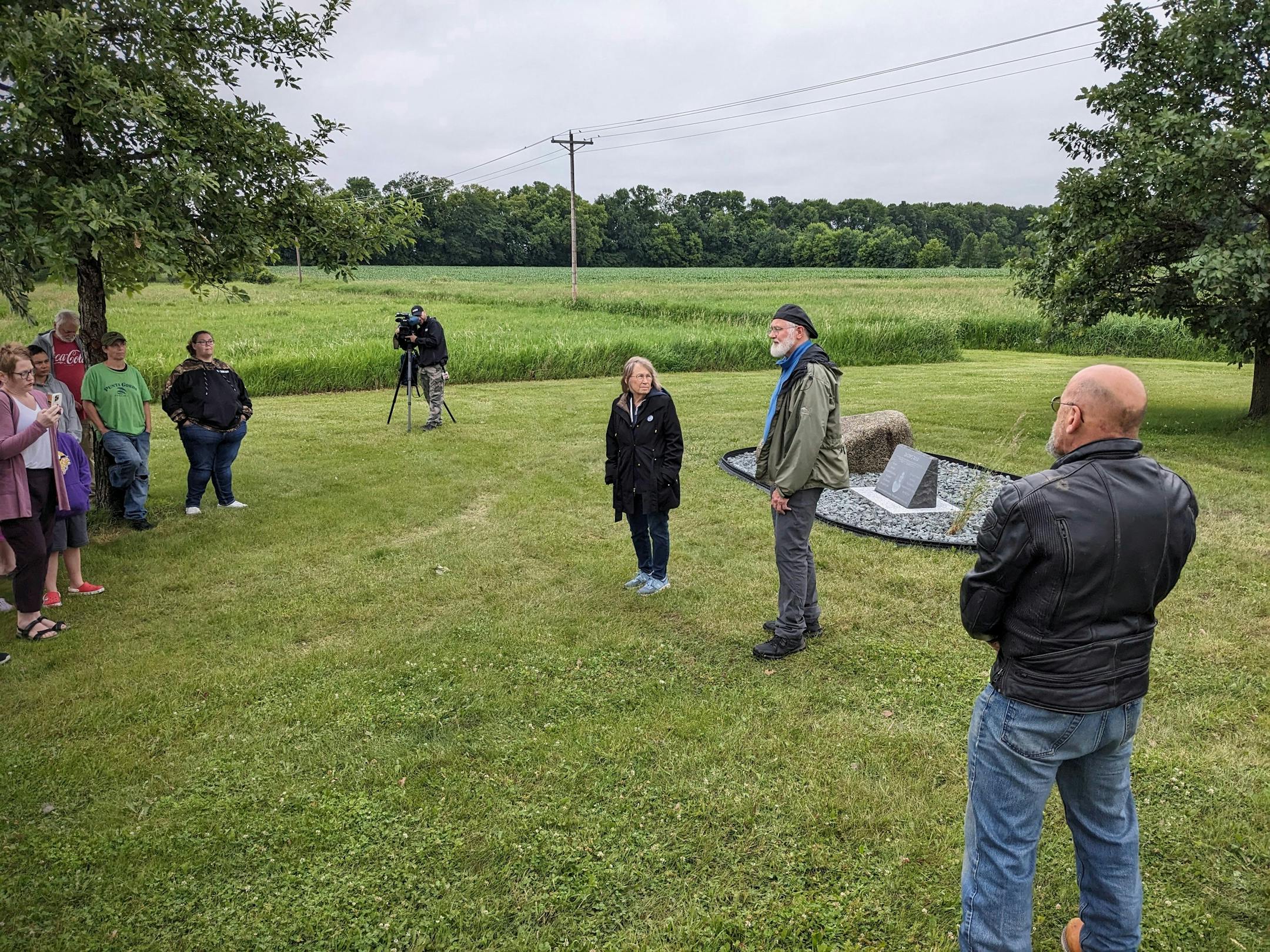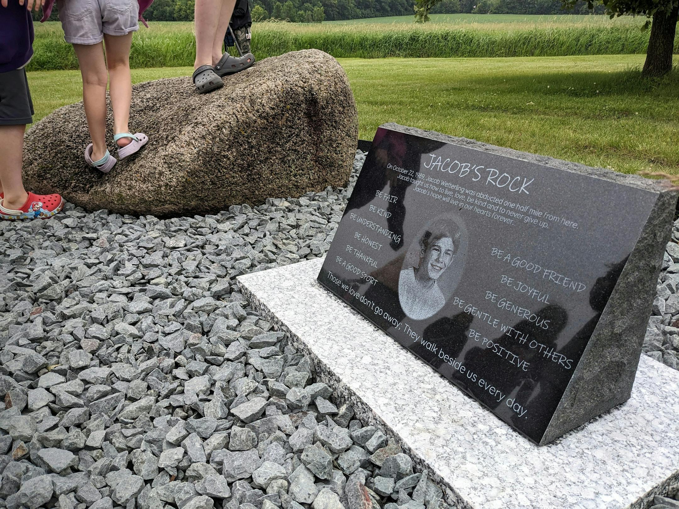 On Wednesday, almost 26 years since the trees were planted and nine years since the Wetterlings learned what happened to their son, they gathered at the site again to officially dedicate the memorial, which now has a plaque acknowledging “Jacob’s rock.”