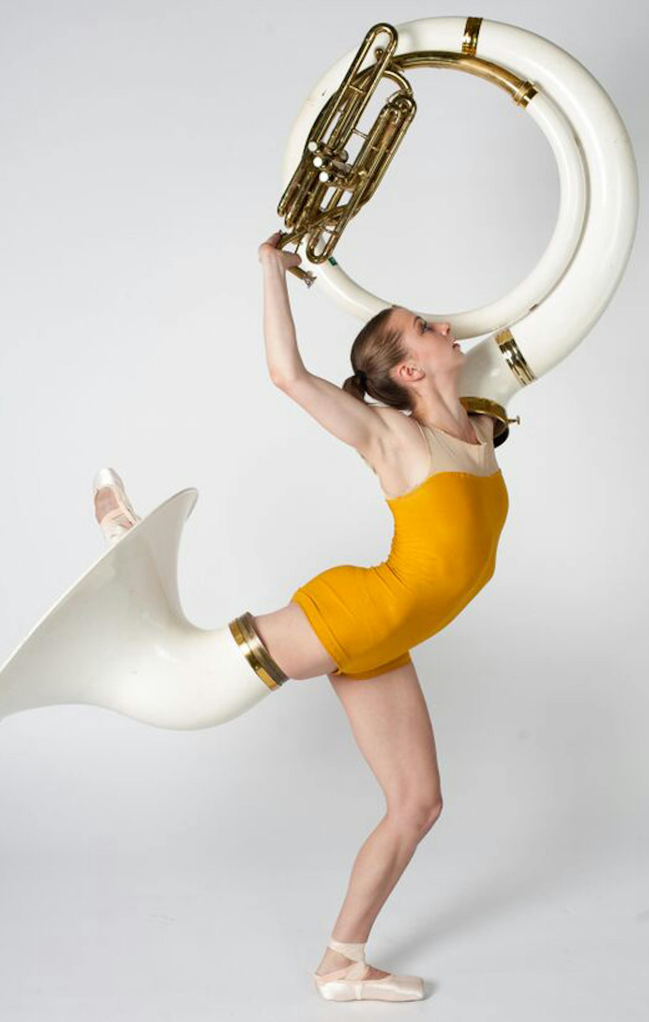 Around them the dancers of James Sewell Ballet (JSB), dressed in vintage cheerleader outfits and sports uniforms, embark on a journey toward an imagined youth. They glide on hover boards in a mesmerizing ballet or get swallowed by a giant inflatable ball with a tube opening in the middle. They even grow musical instruments on their limbs, in scenes that resemble a Salvador Dali painting.