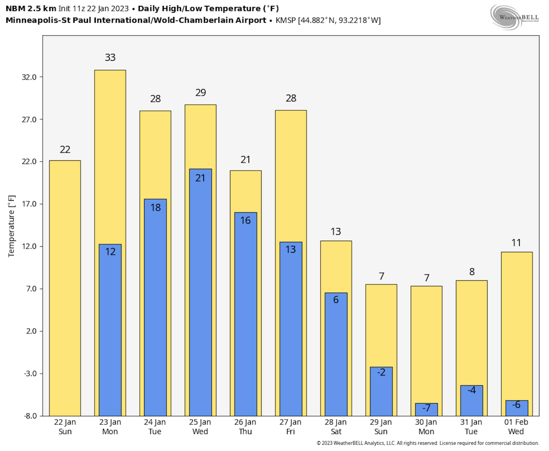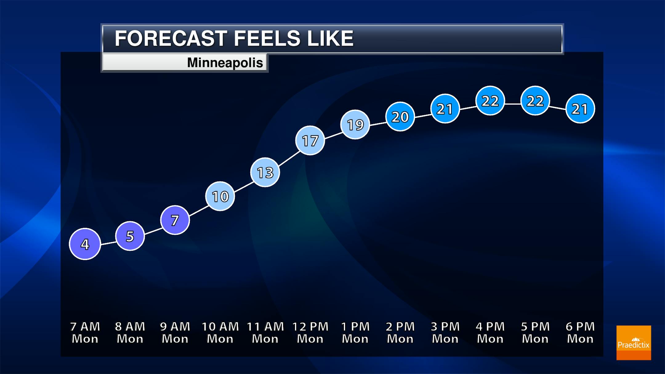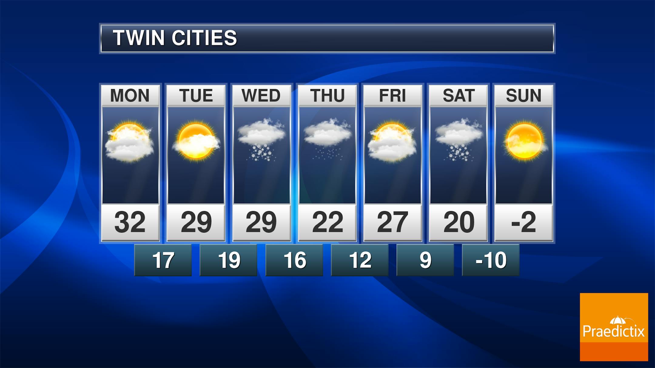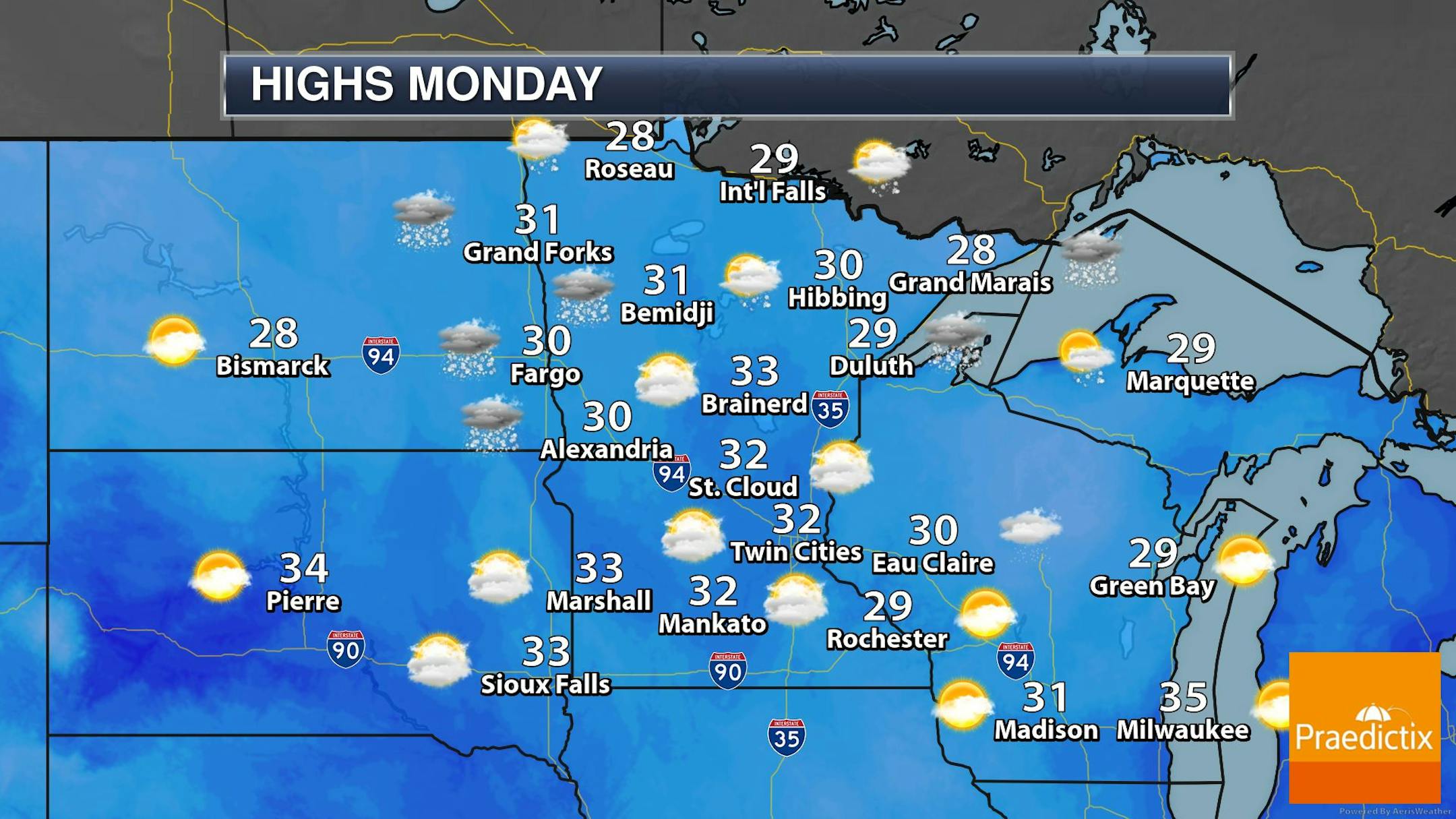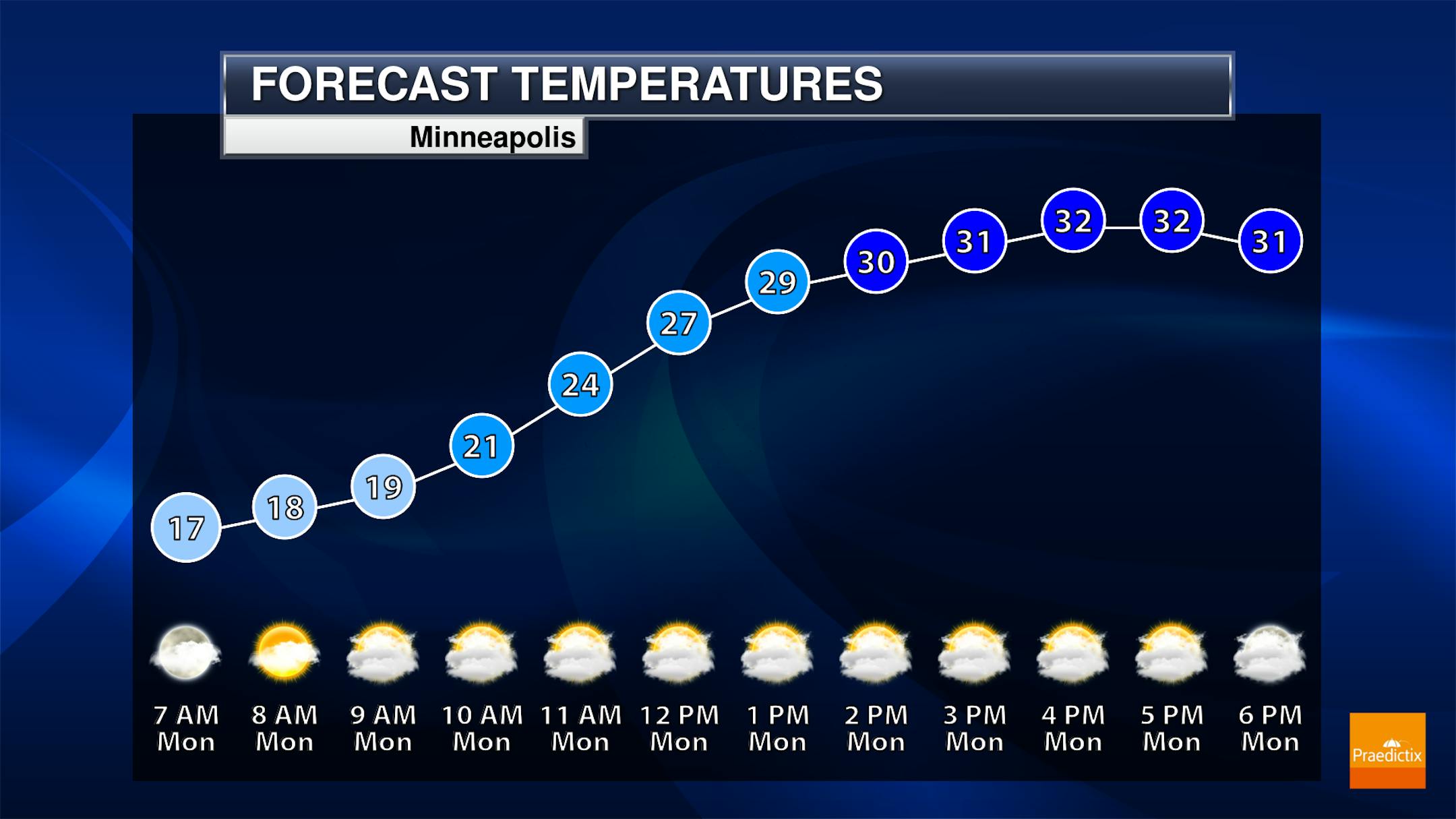 The weather outlook for the Twin Cities on Monday, January 23rd shows well above average temperatures with a high approaching the freezing mark by the afternoon. Skies will remain cloudy with winds picking up out of the northwest in the afternoon.