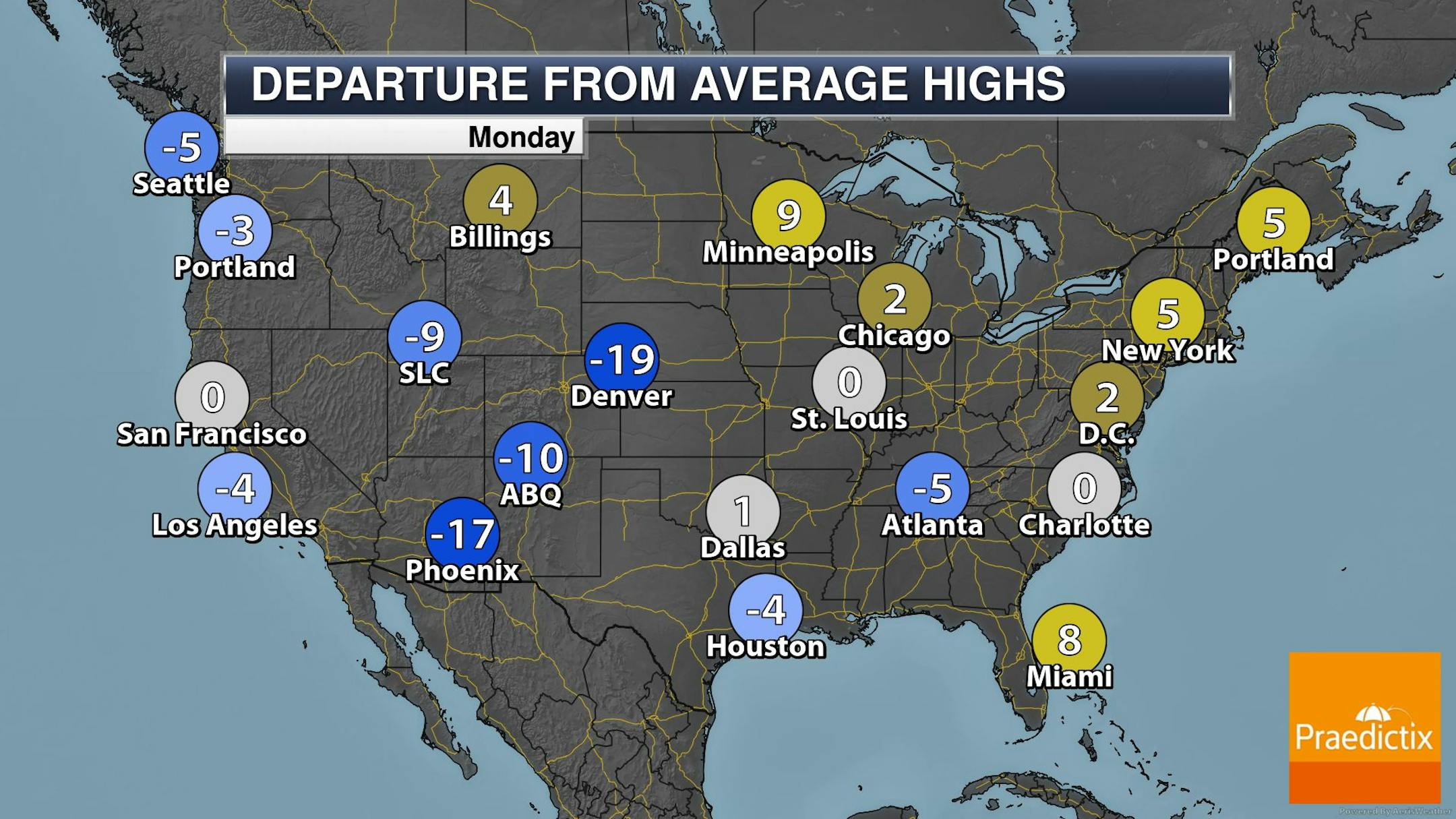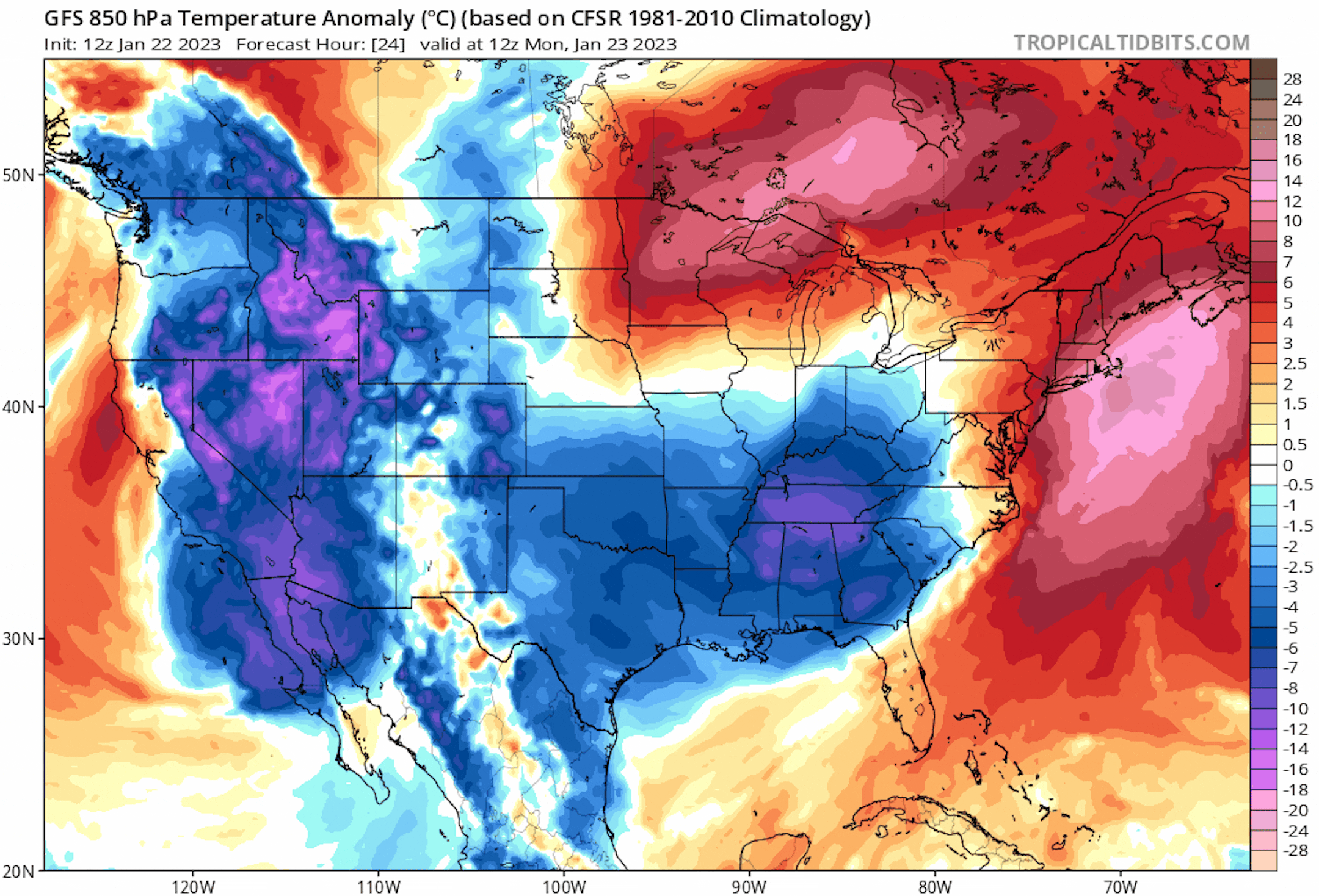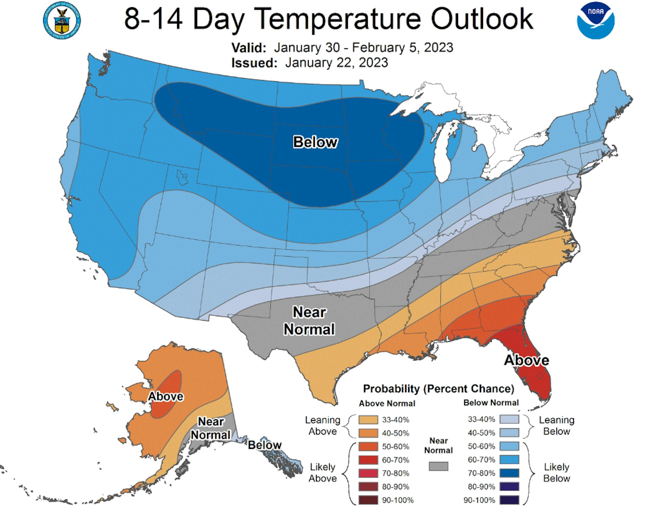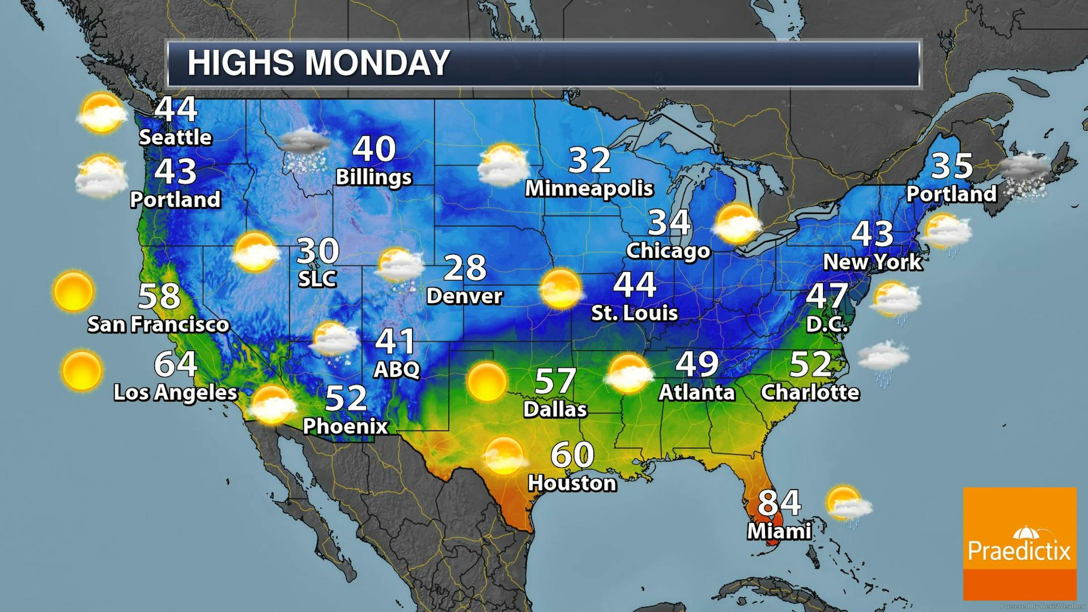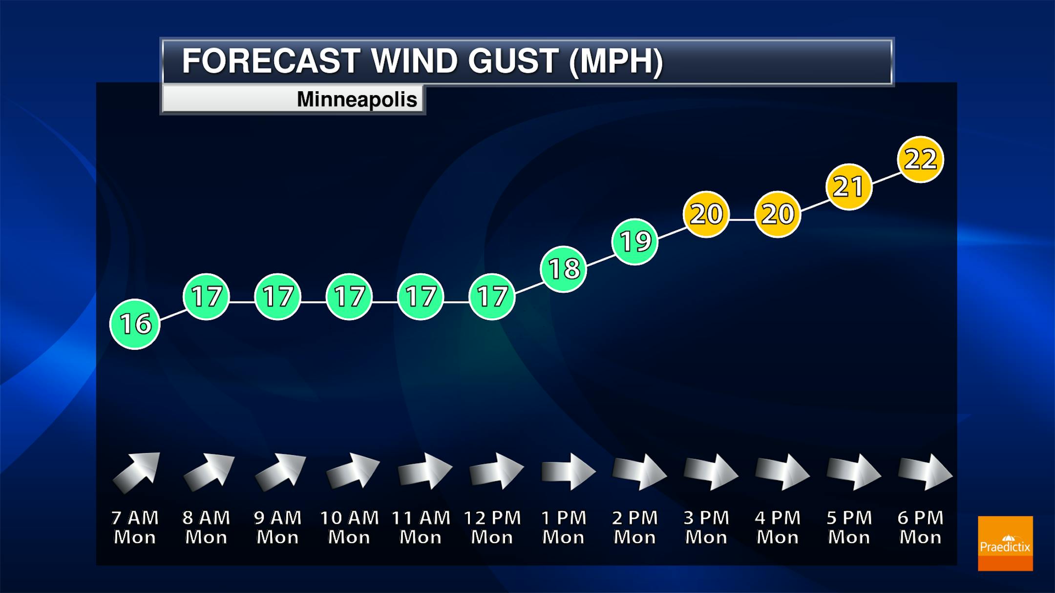 The weather outlook for the Twin Cities on Monday, January 23rd shows well above average temperatures with a high approaching the freezing mark by the afternoon. Skies will remain cloudy with winds picking up out of the northwest in the afternoon.