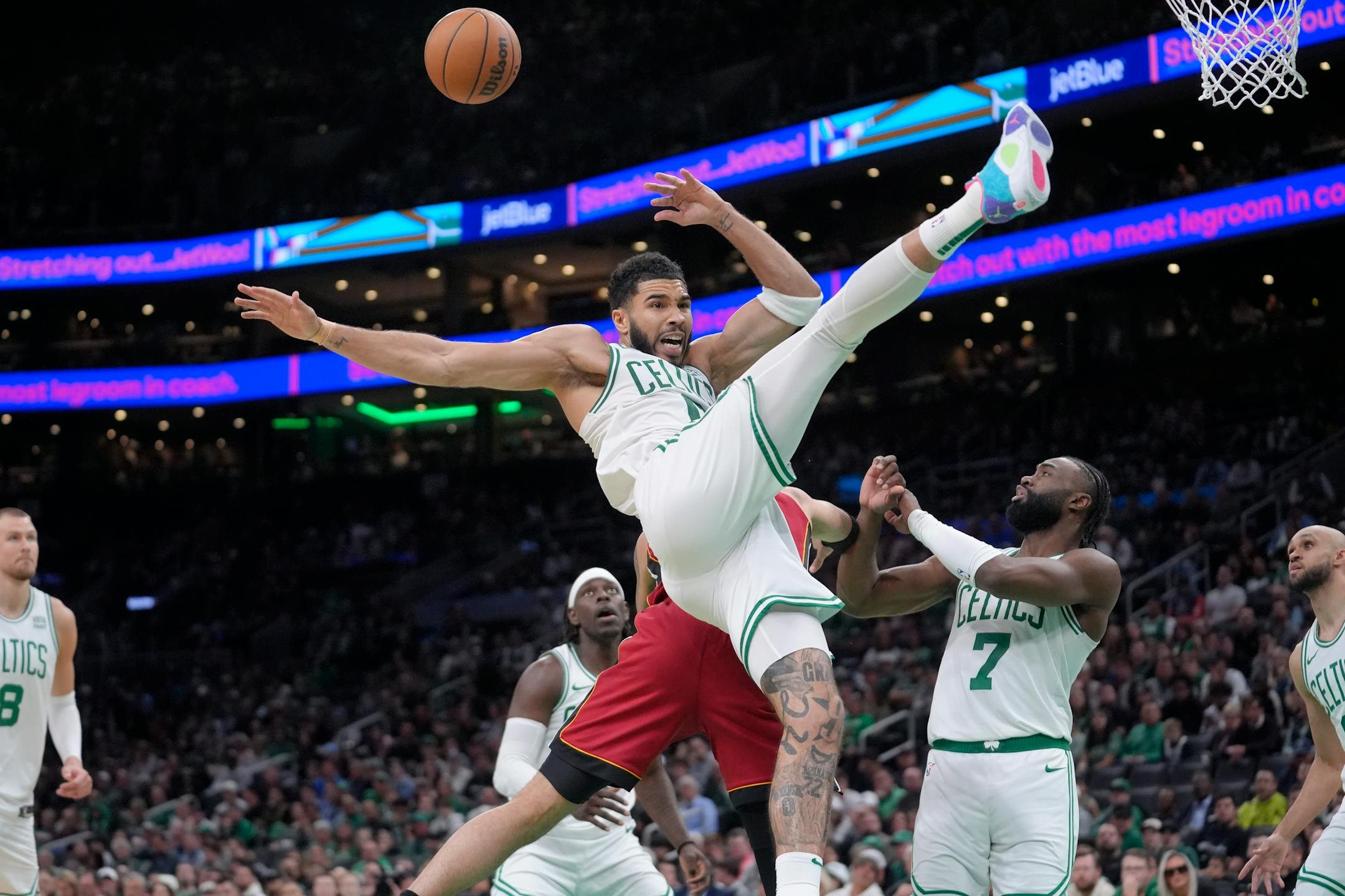 Jayson Tatum notched his first career playoff triple-double with 23 points, 10 rebounds and 10 assists to lead Boston past the Miami Heat 114-94 on Sunday to open their first-round playoff series.