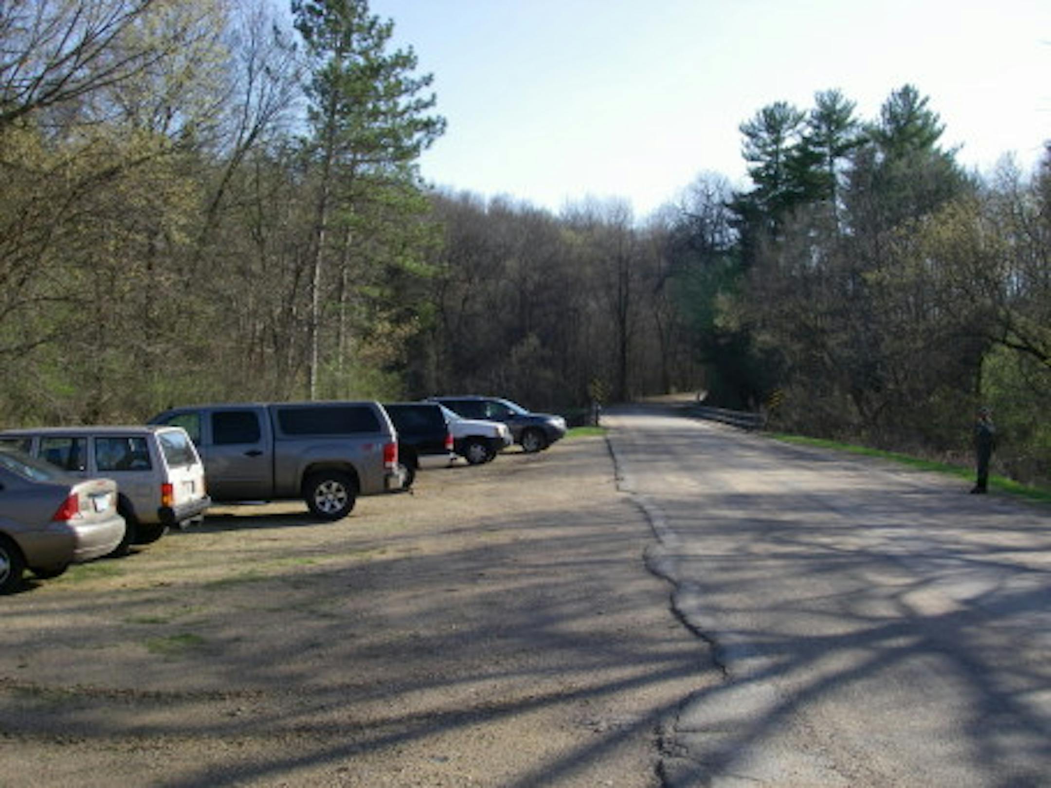 Eight vehicles at trout stream bridge access. If you can't get away from the crowd you can still have a successful day on the stream.