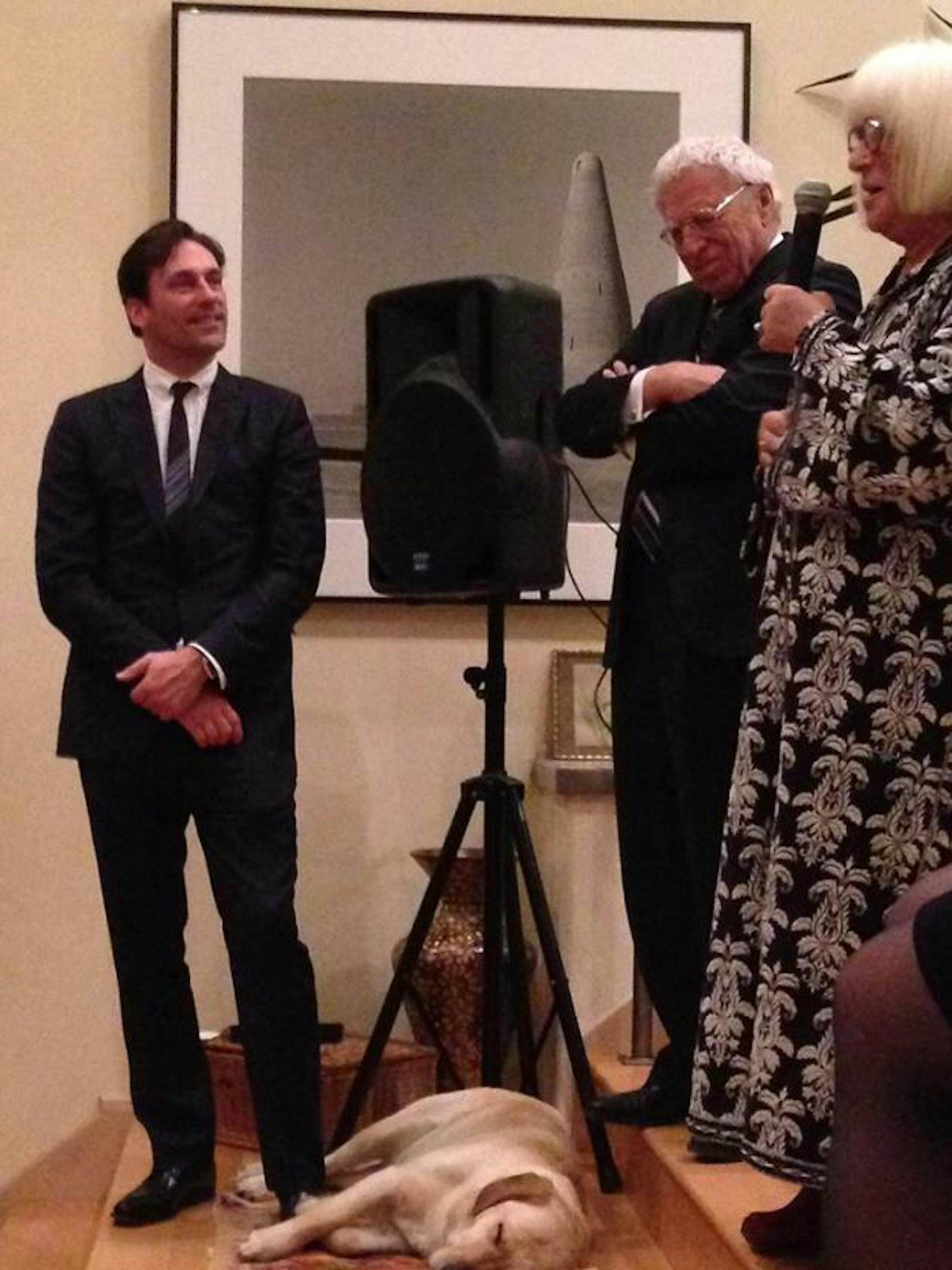 Jon Hamm smiles at hosts Sam and Sylvia Kaplan at a fundraiser they held for Sen. Al Franken. Sonny Boy the lab appears to be the only one in the room not enthralled, but he wound up getting some laying on of Hamm hands anyway. Photos by Susan Lenfestey.