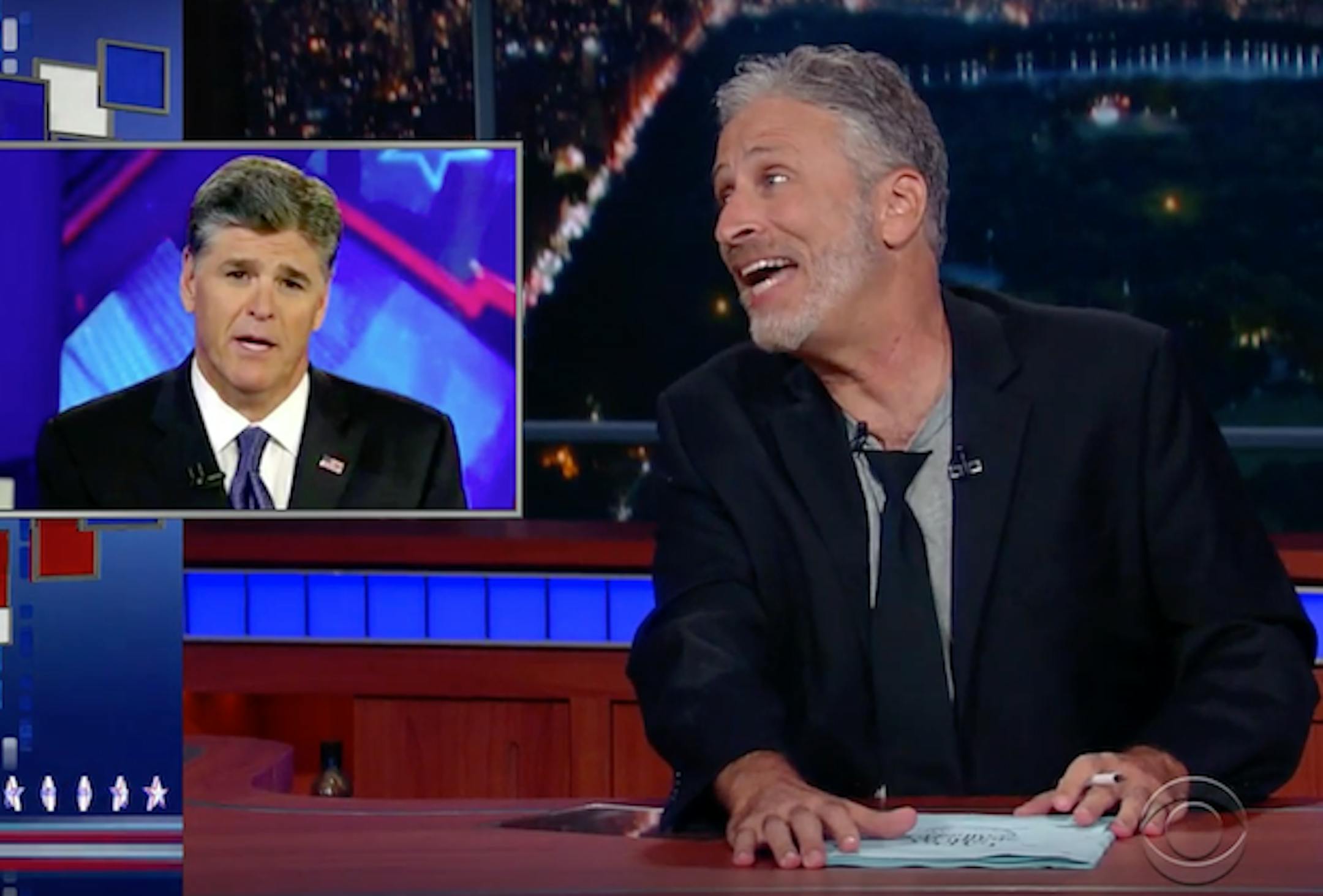 In an unannounced cameo Thursday night, the former "Daily Show" host emerged from underneath Stephen Colbert's desk, claiming that he's been spending his nights sleeping there (when he isn't tending to the animals on his farm), and then proceeded to remind us why we're missing his voice so much during this unprecedented political season.