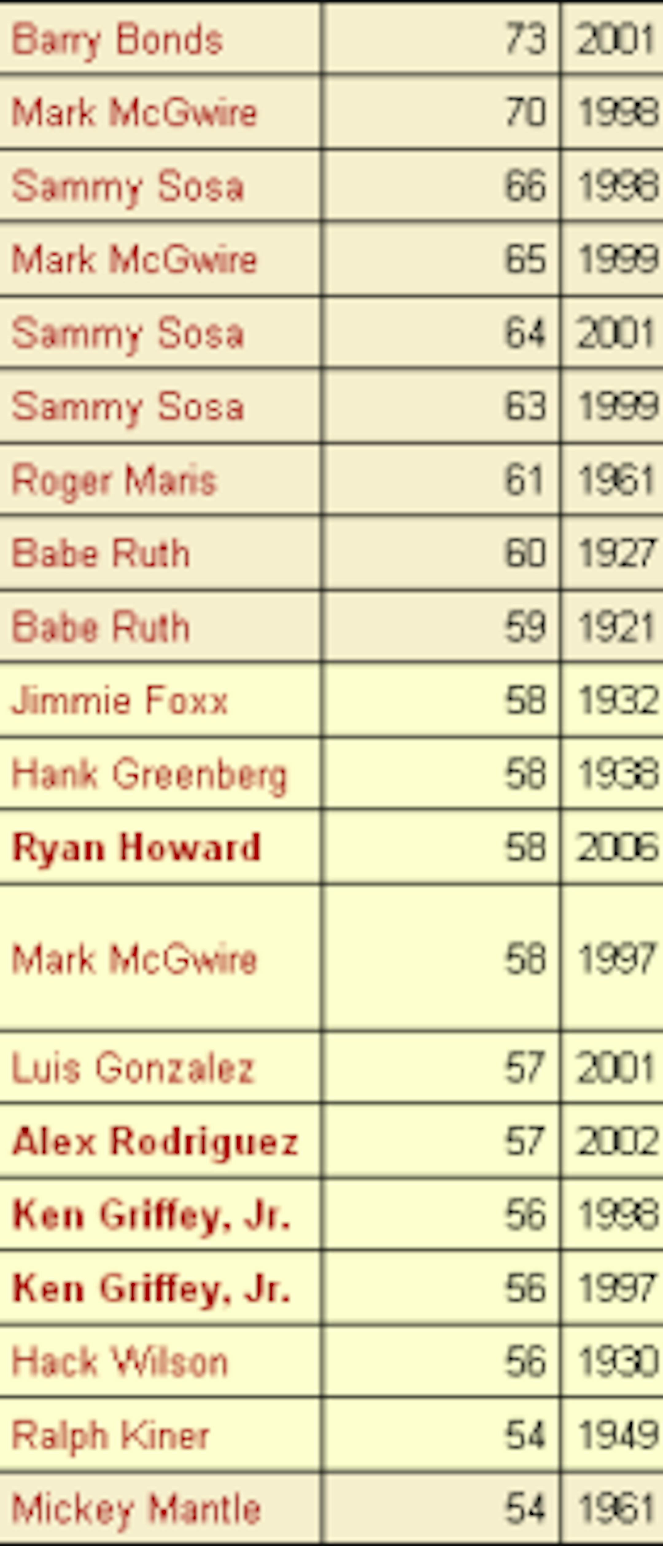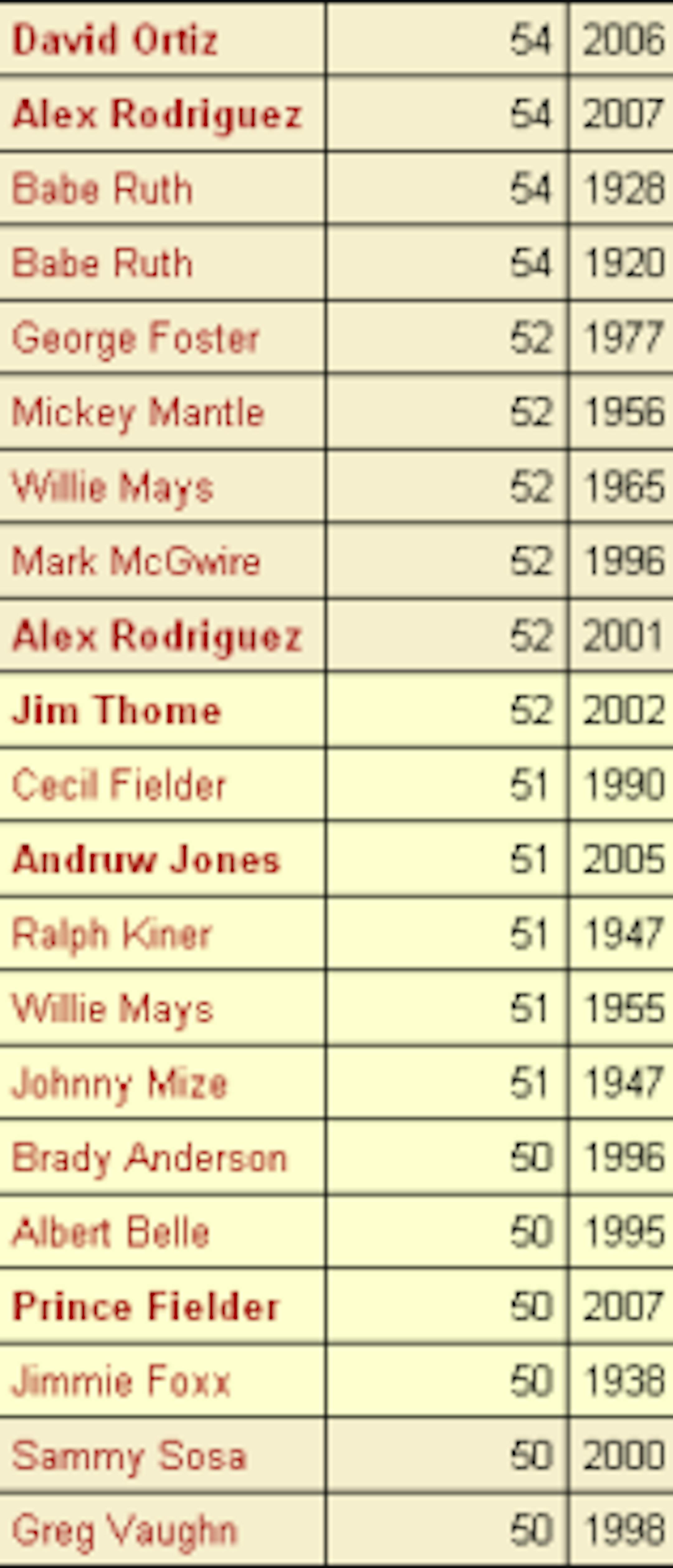 Here, acting as the bread in this word sandwich, are the hitters who have previously whacked 50 home runs or more in a season in Major League Baseball. You will find a few outliers in there -- most notably Luis Gonzalez, George Foster, Brady Anderson (and even Roger Maris). You will also not find Hank Aaron, Harmon Killebrew and a host of other big-time sluggers. Anderson, who hit nearly one-fourth of his 210 career homers in that one big season and never hit more than 24 in any other individual year, was clearly the biggest anomaly on that list ... until now? We ask that because Jose Bautista, who will turn 30 next month and had never hit more than 16 homers in a season, blasted his 50th earlier today. Does Bautista replace Anderson as the most unlikely member of that list? Is there someone else we are overlooking? Your thoughts in the comments, please.
