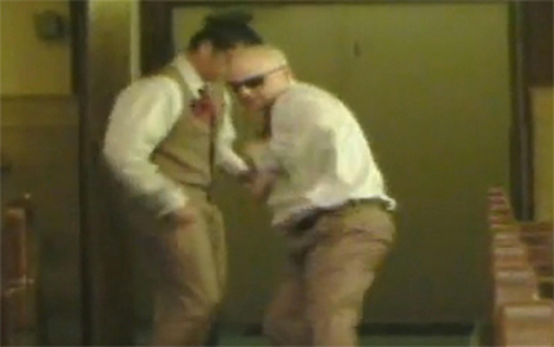 Among the highlights was Heinz's somersault entrance, which thrilled the guests, who clapped in unison throughout the 5-minute performance. And Peterson, in her traditional white gown, shook her hips while jabbing her bouquet in the air. One of the men in the wedding party walked on his hands, and most donned sunglasses for the indoor ceremony.