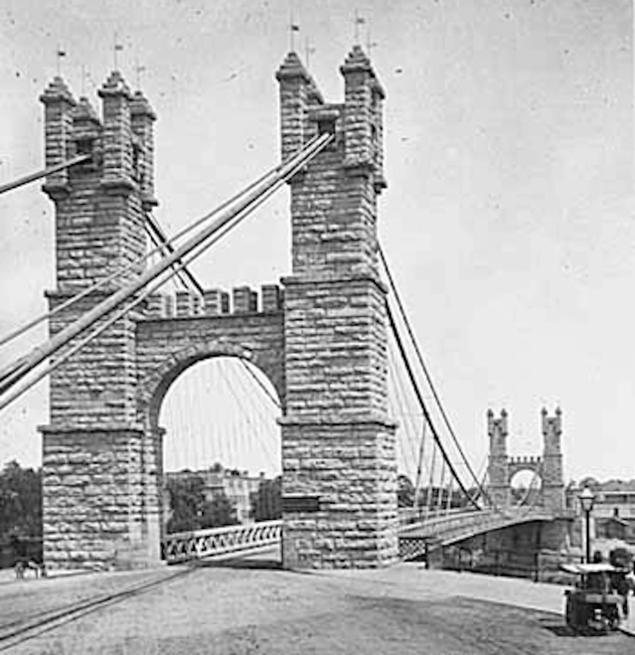 Construction of the second bridge to cross the Mississippi River at Hennepin Avenue, shown here in about 1880, was nearing completion when a man known as Banjo Ben attempted to cross the 670-foot span on one of the thinner "working" cables.
