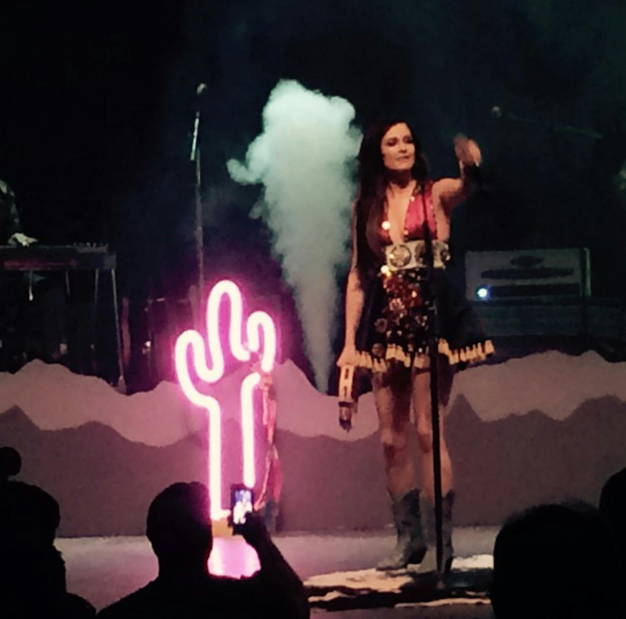 Performing with musicians dressed in rhinestones and Christmas lights on a kitschy stage spiked with neon cactuses and sandalwood incense, Musgraves offered most of the songs from the Grammy-winning "Same Trailer Different Park," including the modest hits "Merry Go Round" and "Follow Your Arrow," as well as a handful of new numbers.