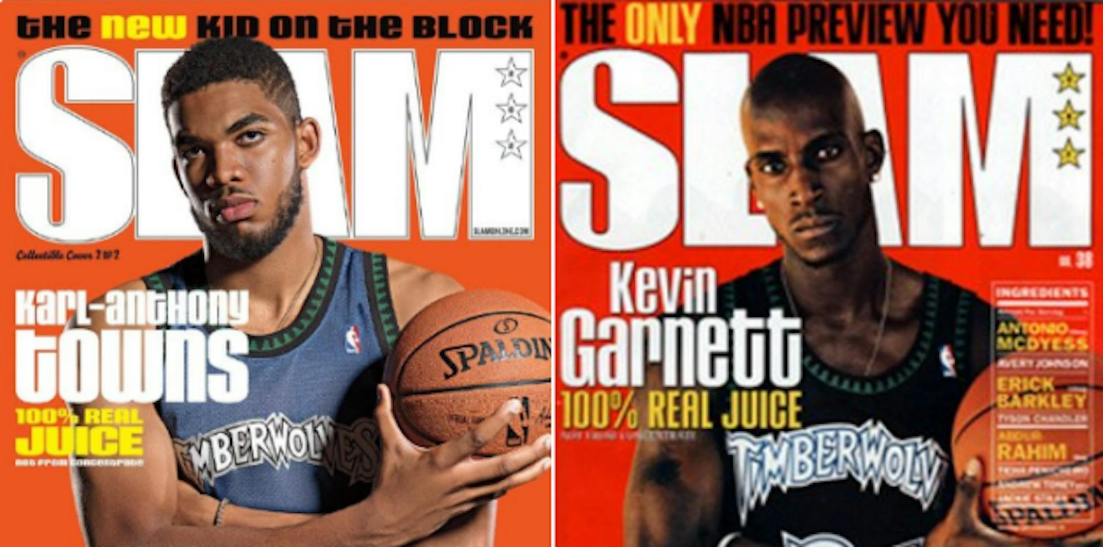 Towns won Rookie of the Year as Garnett's teammate last season and is now poised to lead the franchise into a new era of success. While Towns hopes to follow in the footsteps of Garnett's career success, he wants to do it by blazing a new trail, which is why Slam created two covers for its next issue.