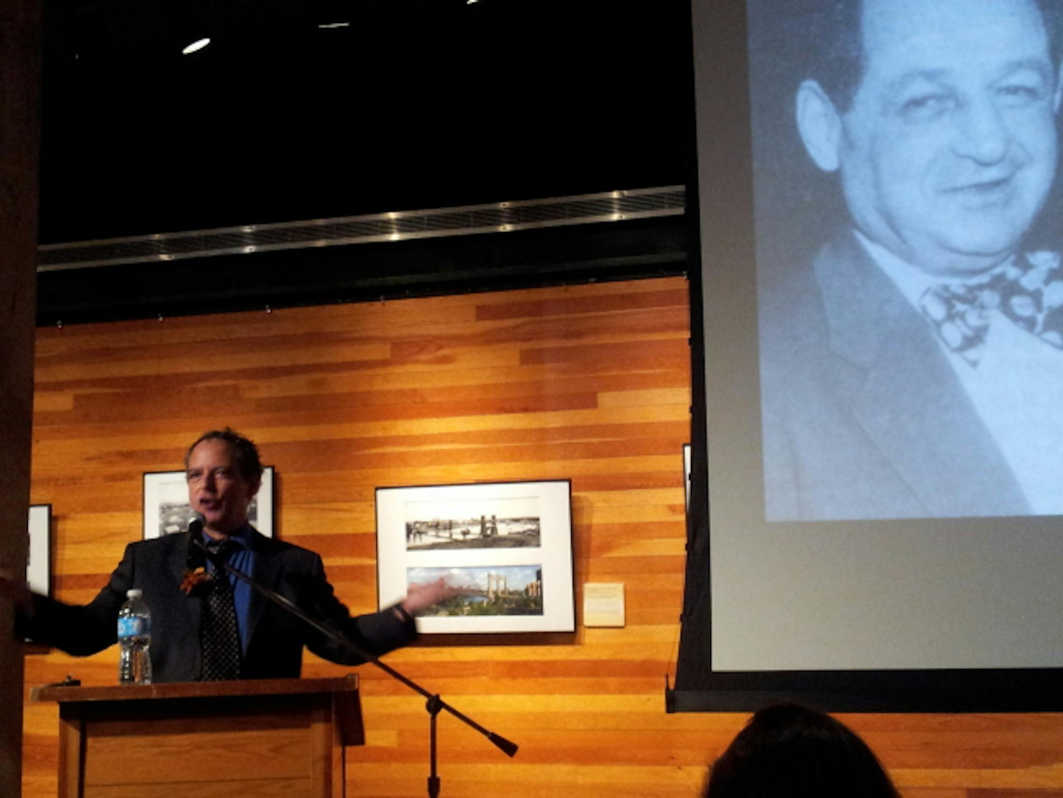 At Mill City Museum Thursday, author Neal Karlen gave an animated recounting of Minneapolis's Jewish-mafia era in the 1940s and '50s. That's club owner Augie Ratner on the right. Photo by Fawn Bernhardt-Norvell.