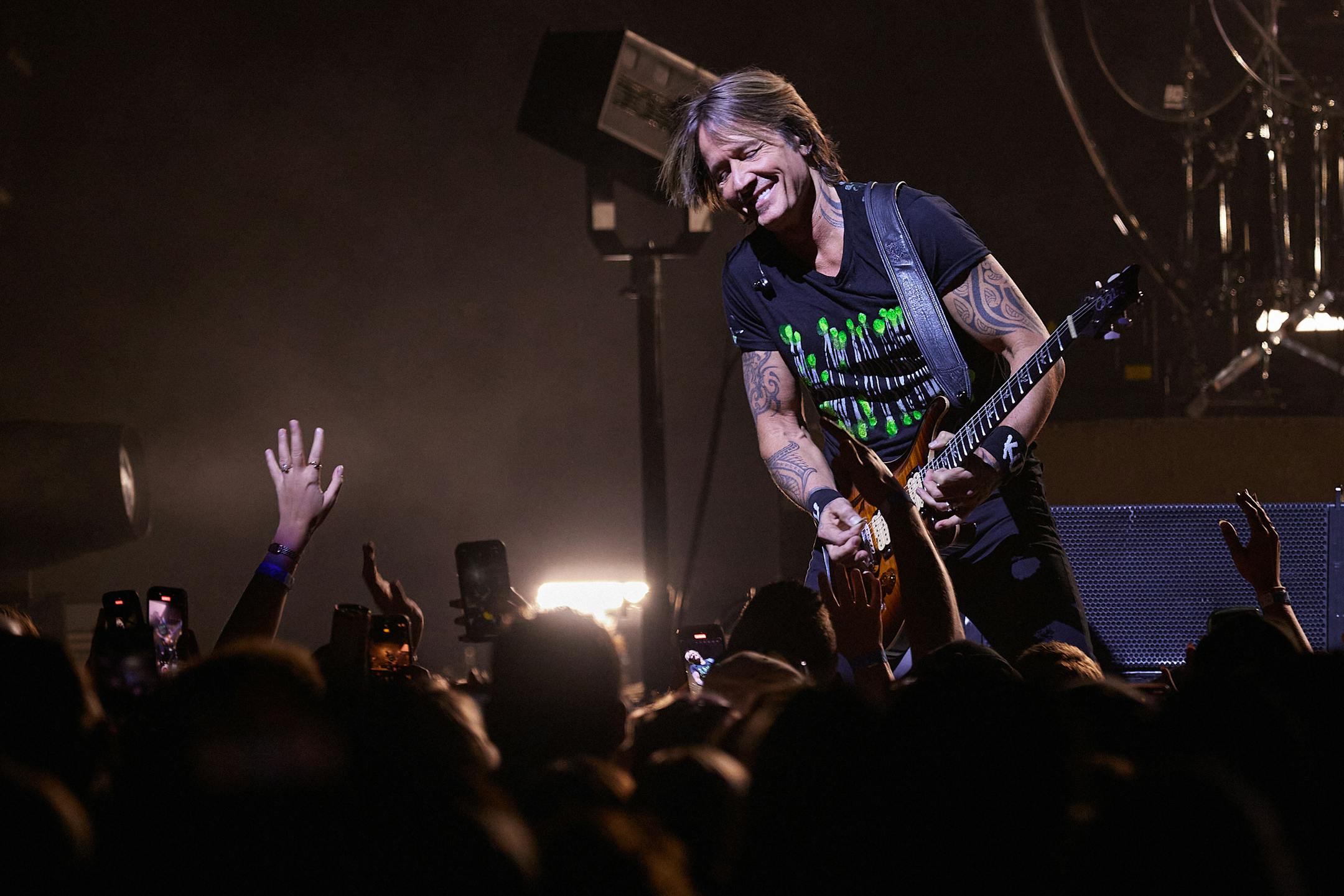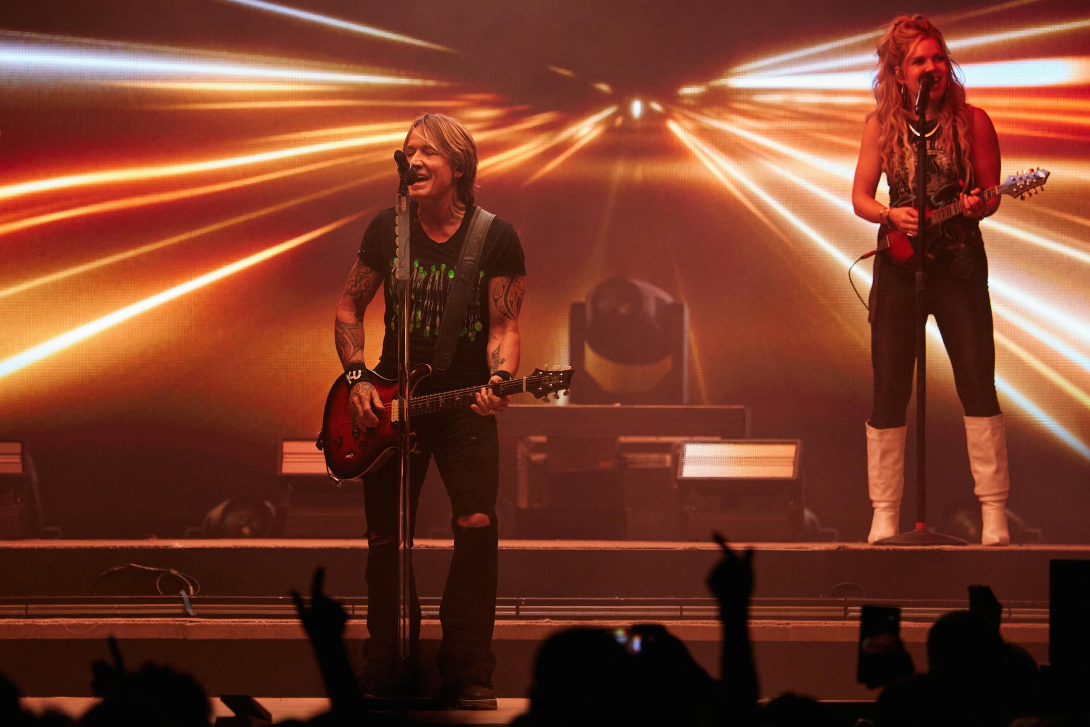 On Friday at the former Xcel Energy Center, on “Long Hot Summer” alone, Urban showed his vast guitar range, bending blues notes, doing wah-wah without a wah-wah pedal, popping a bass line, tapping percussively and going all Jimi Hendrix to wrap things up.