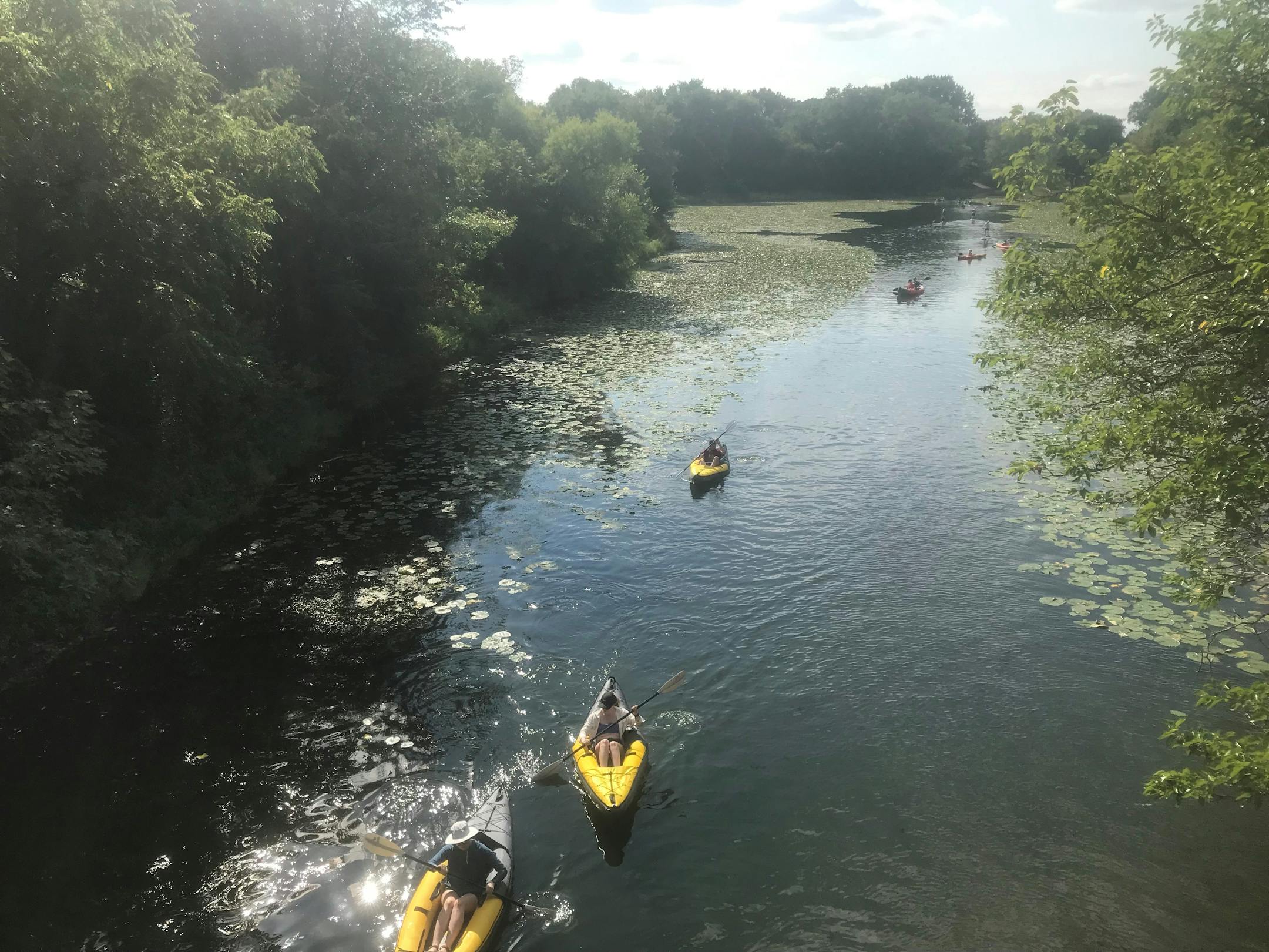 "This is the first time we've gotten this far!" said Amanda Riddlec of Hopkins as she steered a paddleboard under one bridge. Riddle has paddled around Cedar Lake many times before but had never been through the channel.
