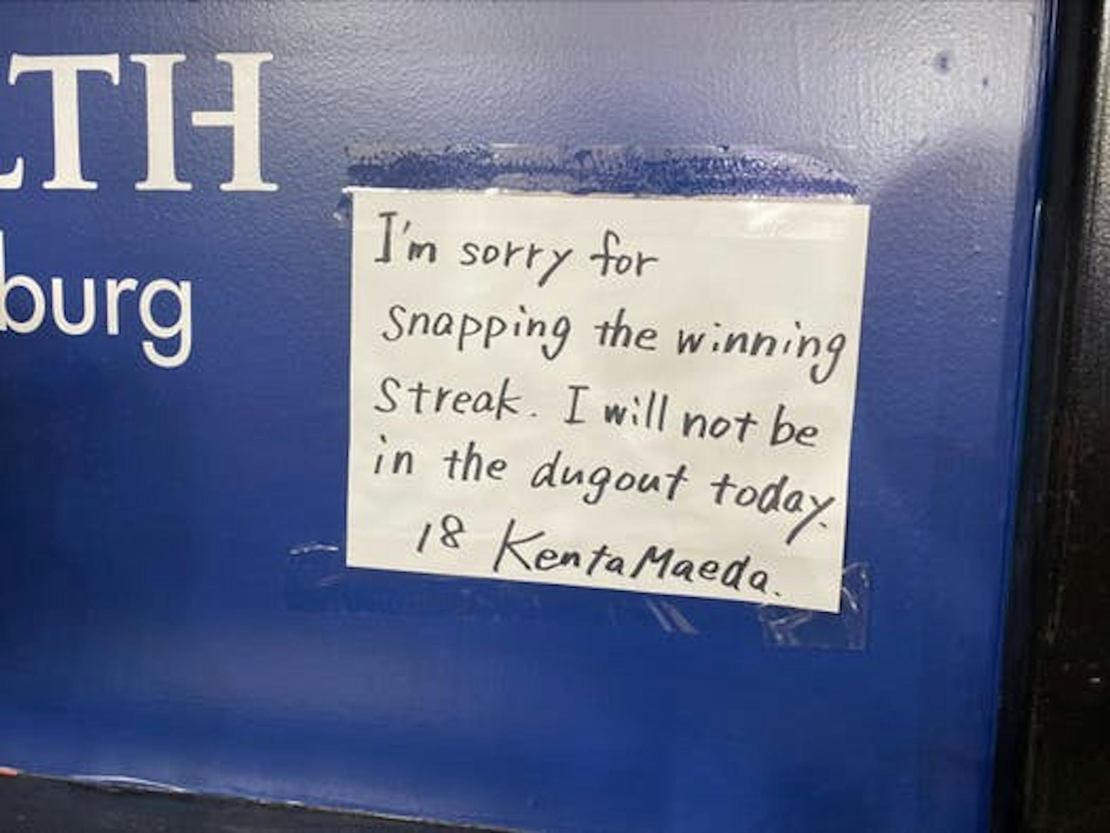 Maeda is a superstitious guy in general, so for Saturday's game, he stayed in the clubhouse for the first couple innings and then went back to his hotel to watch the rest of the game. He planned to do the same Sunday. He left a note in the dugout to explain his absence, which read: "I'm sorry for snapping the winning streak. I will not be in the dugout," signing his name and No. 18.
