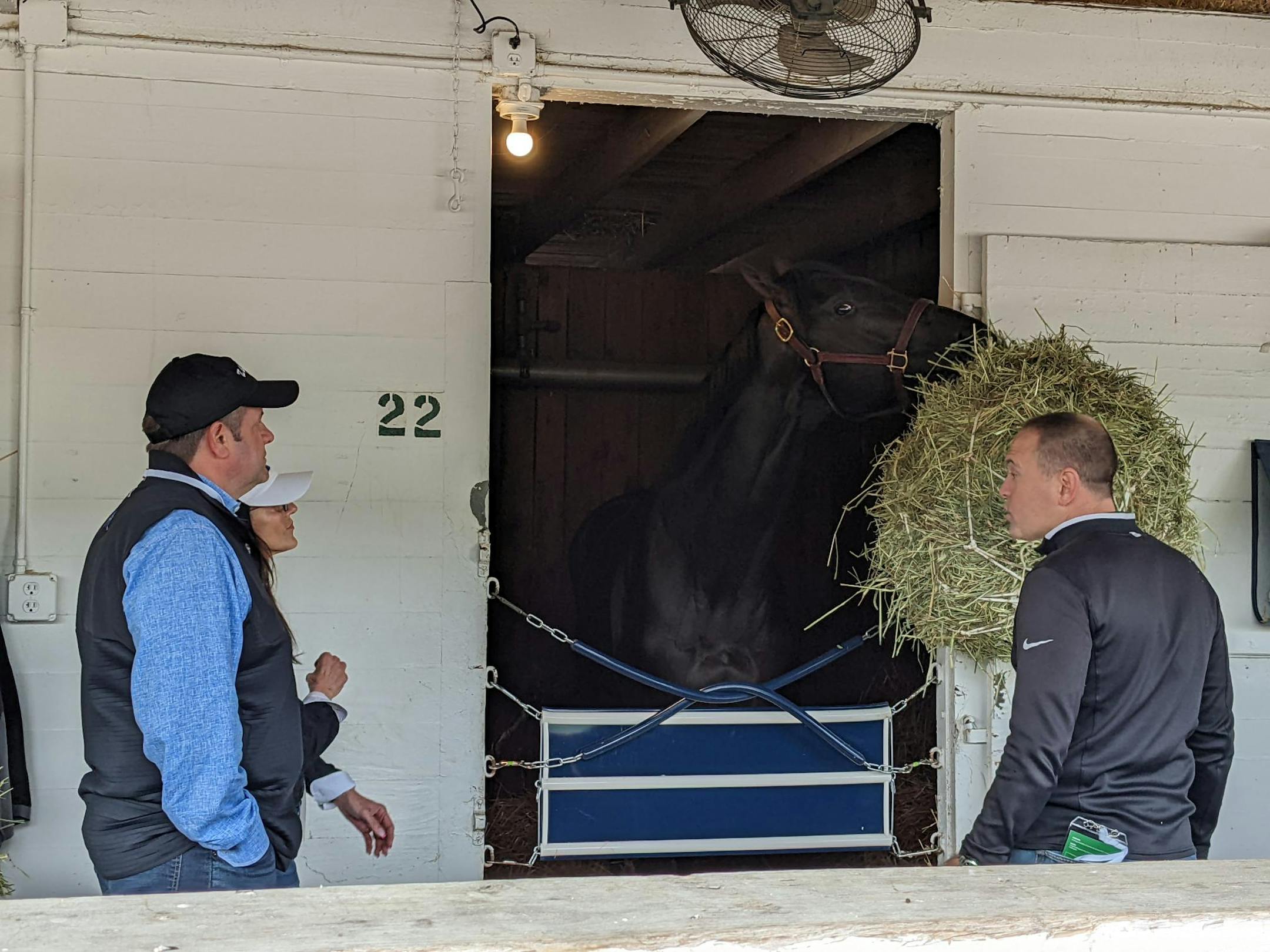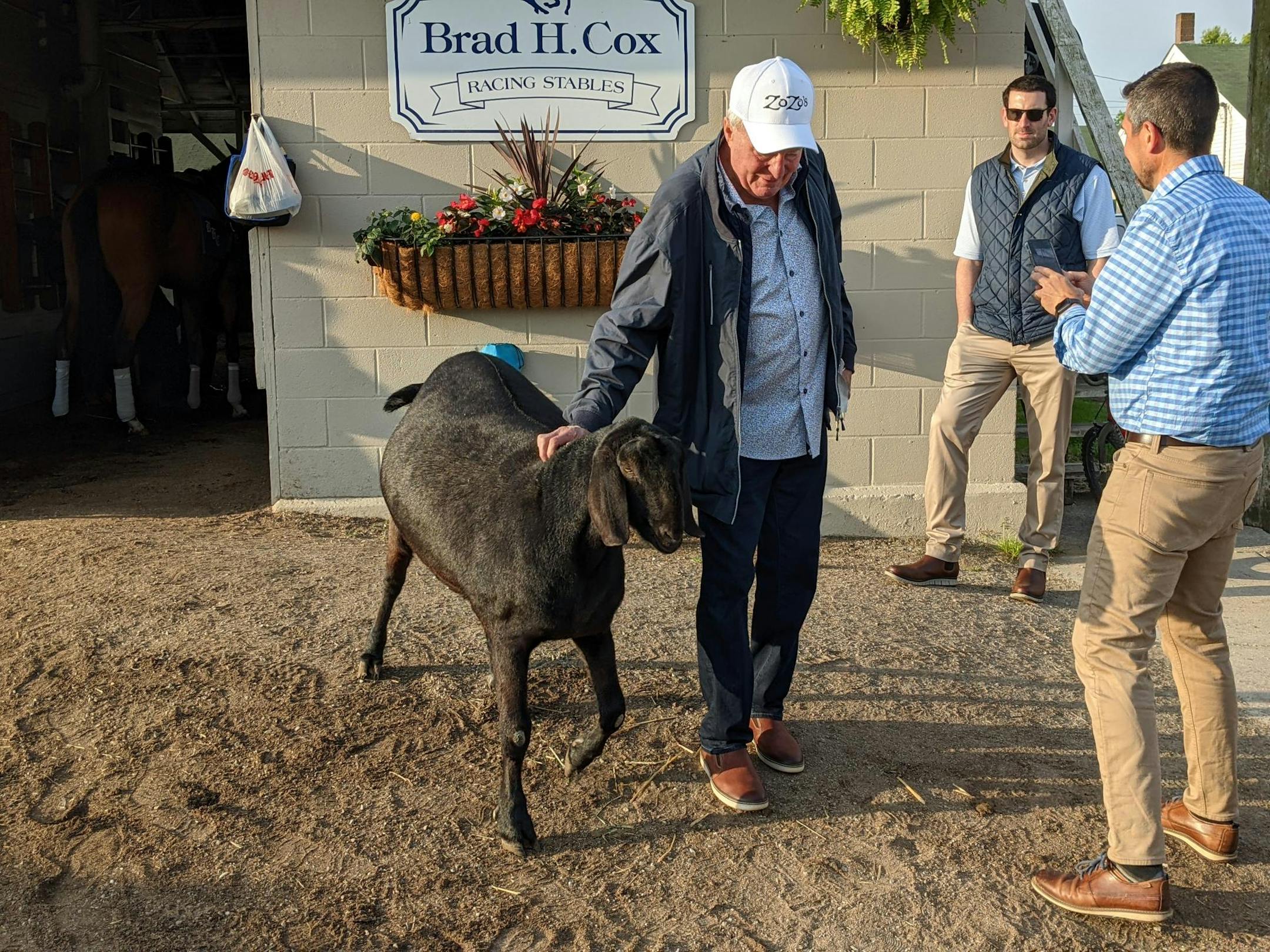 The Cox barn was a popular spot because of another resident celebrity. A stout black goat, Mr. Man, patrolled the shedrow looking for pats and attention. (You can follow him on Twitter! @1_misterman) At one point, there was a crowd of people around him, taking selfies.
