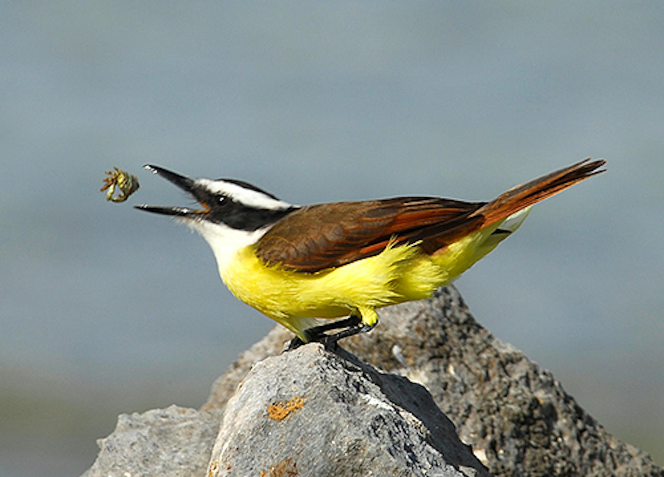 The kiskadee below was photographed along the Caribbean shore in southern Mexico. It was about to swallow that crab. The bird is slightly larger than a Hairy Woodpecker. It's a small crab.