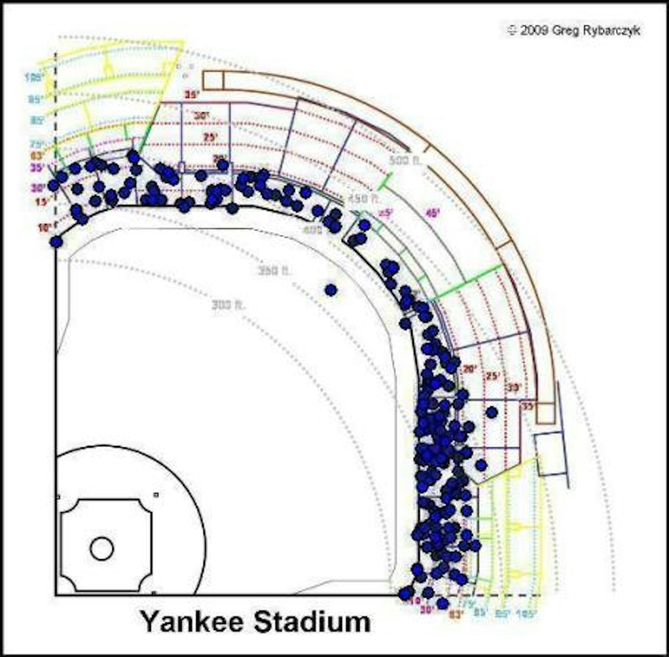 As you can see, in contrast to the Metrodome, Target Field provides little favors for the lefty. Attempting to drive the ball to center is likely to result in a long fly out. In terms of the impending playoffs, Kubel's success with the home field advantage may come by (1) increasing his patience at the plate or (2) by pulling the ball more, giving him a higher likelihood of hitting that home run. However, unlike Bear Stearns, Kubel's stock in New York City may skyrocket in the next week. Contrary to the layout of Target Field, New Yankee Stadium's center field and right-center field is very inviting for left-handed hitters. While deeper than Target in right-center, the ball carries much better in that stadium, giving lefties a significant advantage:
