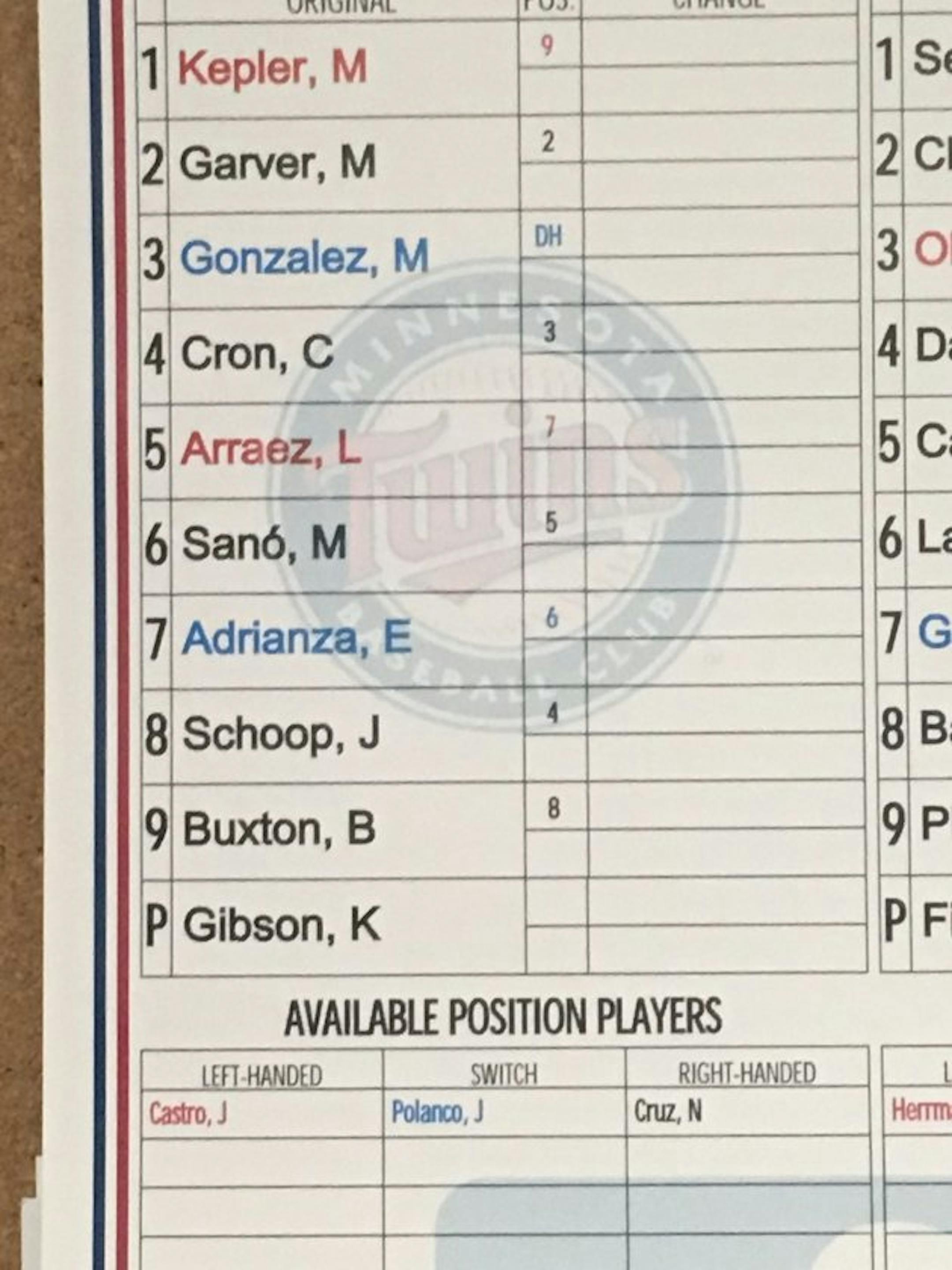 Marwin Gonzalez (sore right big toe) is a late scratch from the Twins lineup. He was set to DH, but will be replaced by Jorge Polanco. So here's the posted lineup, just scratch Gonzalez and insert Polanco: