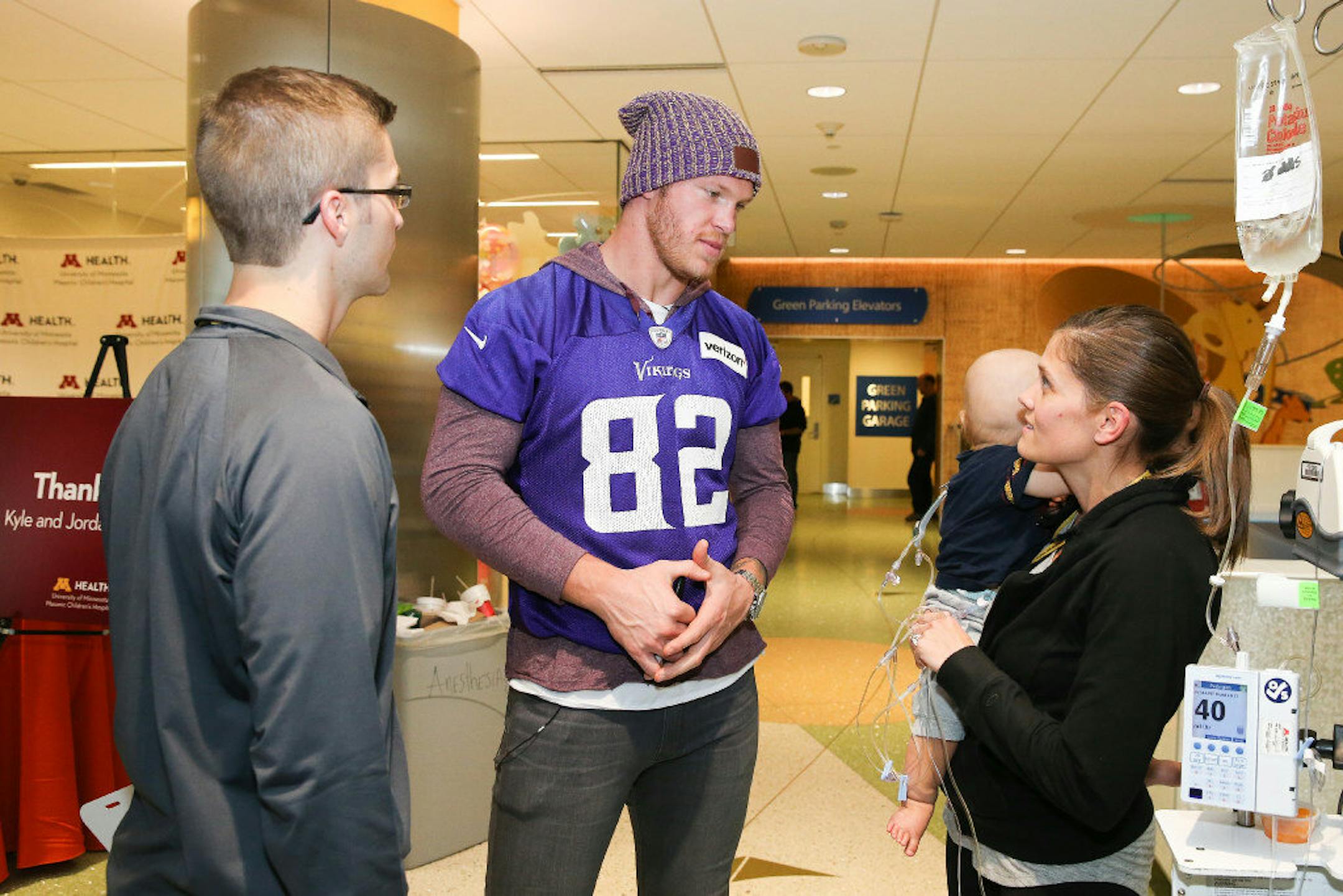 Tight end Kyle Rudolph and his wife Jordan donated $25,000 to Second Harvest Heartland on Monday, to provide 82,000 meals for families in the Twin Cities and kick off a Virtual Food and Fund Drive. Rudolph, the Vikings' nominee for the NFL's Walter Payton Man of the Year Award each of the past three seasons, hopes to raise $200,000 through the fundraising drive.