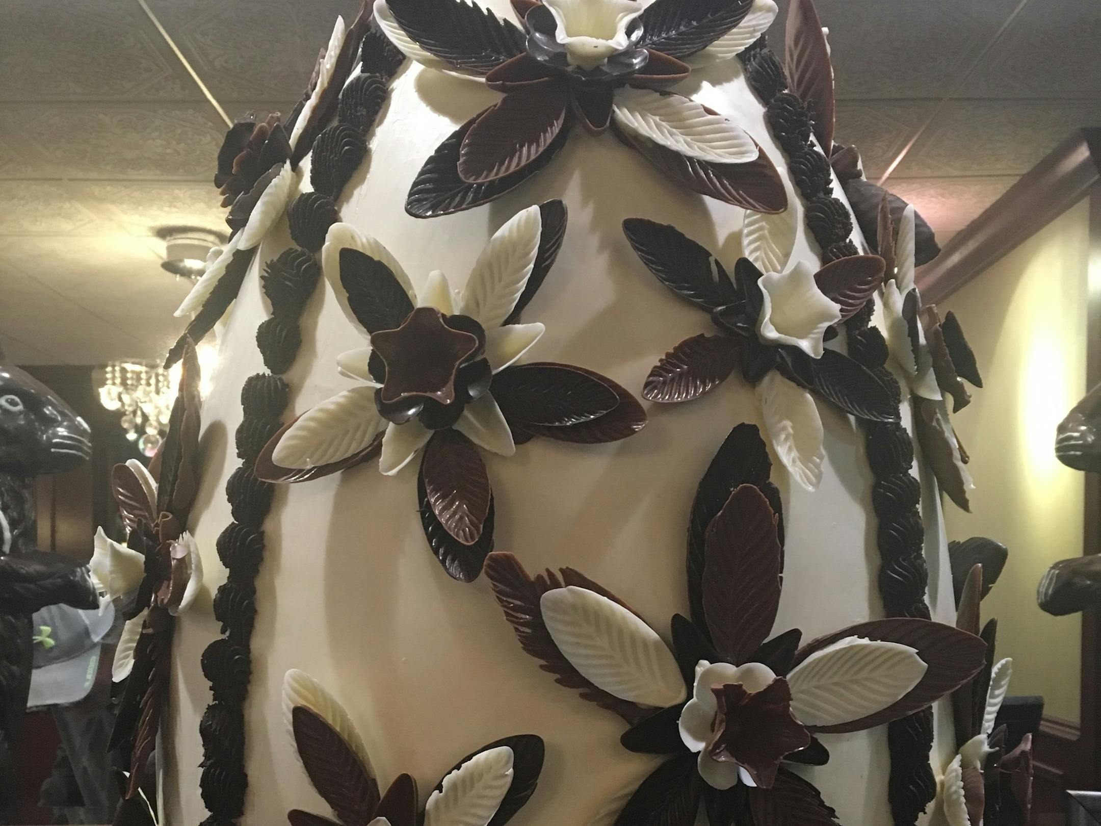 Marty said it took a day to create each half of the egg, which has eight layers of white chocolate. The halves were bonded together with more white chocolate. It took Marty four hours to decorate the egg with 240 chocolate flowers she whipped up in the kitchen.
