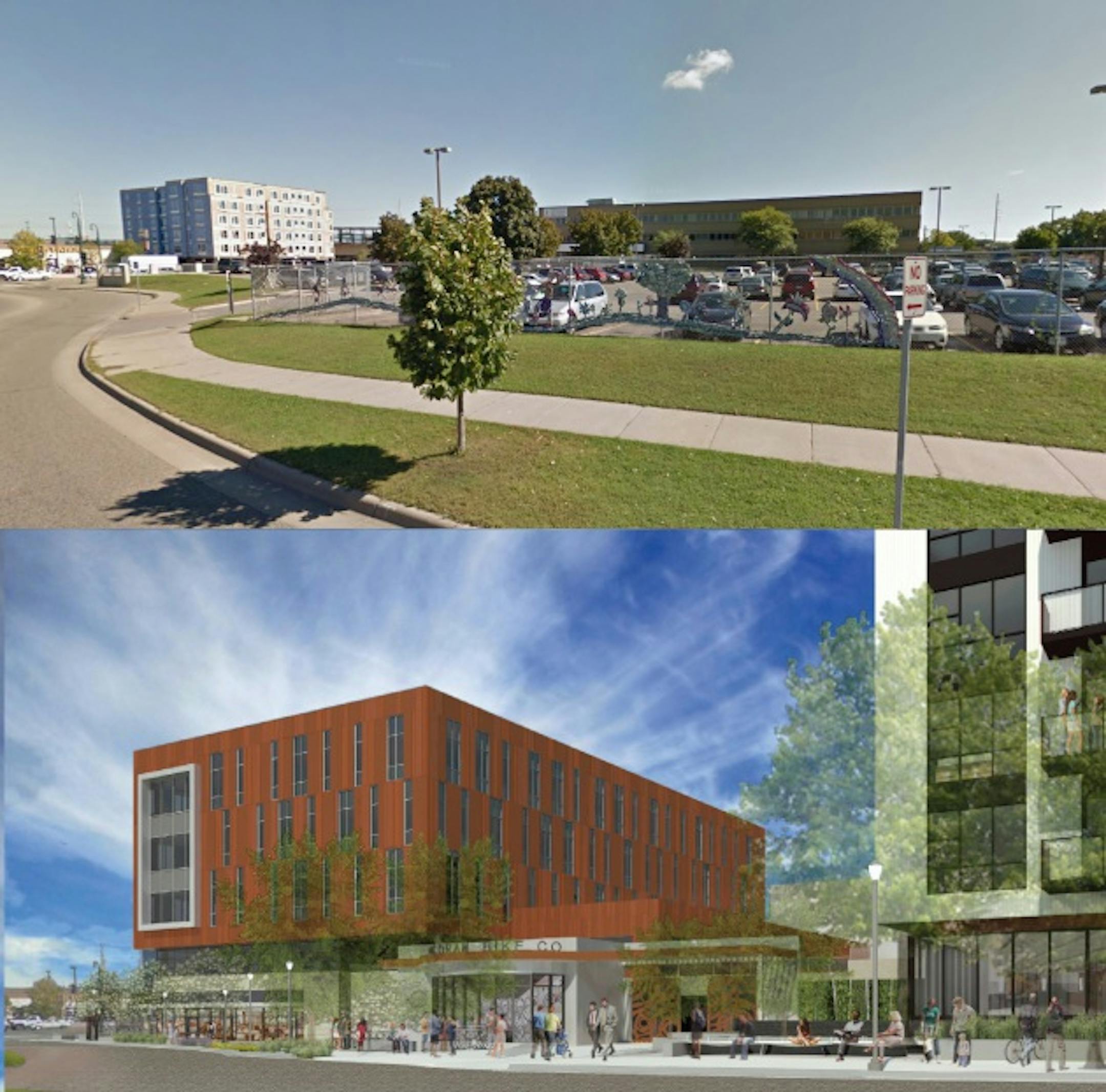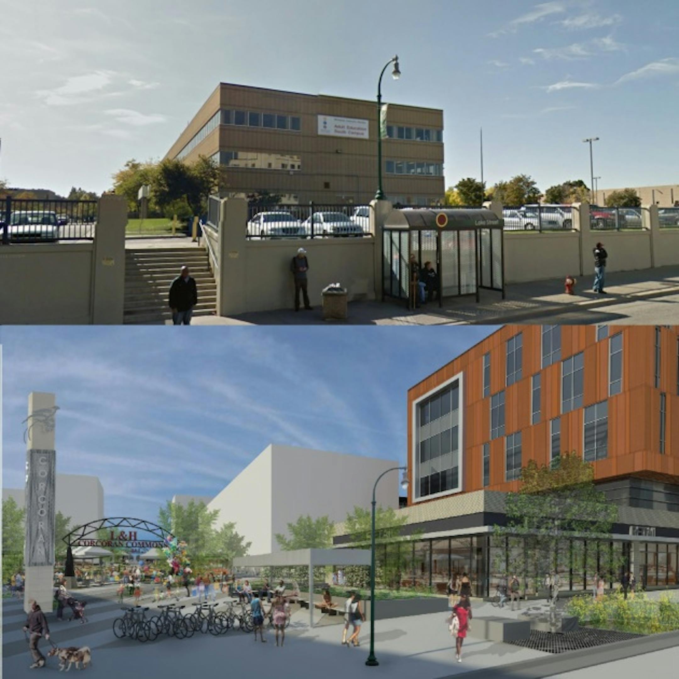 Above: Before and after views of the site, seen from Lake Street just below the light rail station. Click here for the full size image.