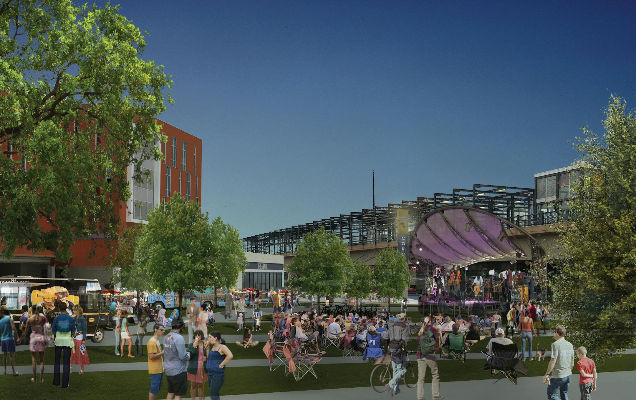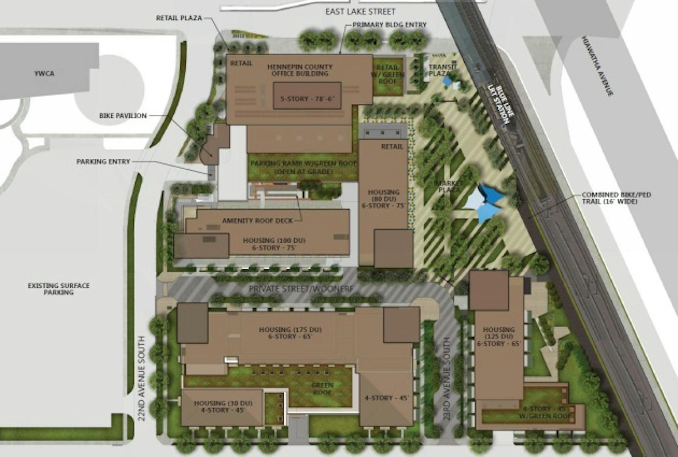The first phase is more modest than the grand vision for the site, illustrated in renderings Thursday night. It includes a hub for county health and human services -- part of a strategy to migrate the services from downtown -- 100 units of market rate housing, a new transit plaza, ground-level retail on Lake Street and a self-help bike repair shop.