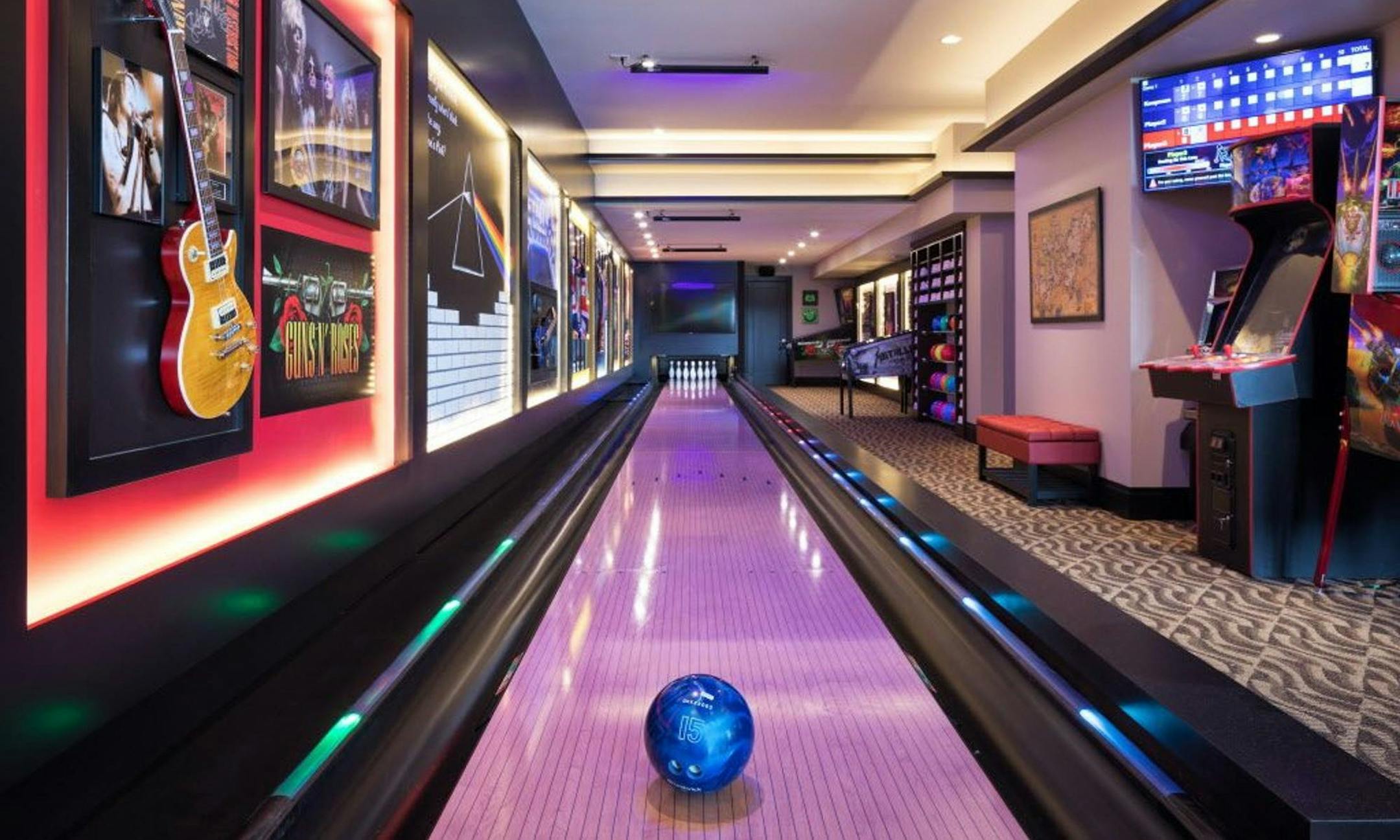 Next to the bowling alley is an L-shaped bar equipped with TVs for sports-watching parties. At the far end of the room, a theater-style lounge plays movies on the 85-inch screen. One more level down is the sport court and sauna.