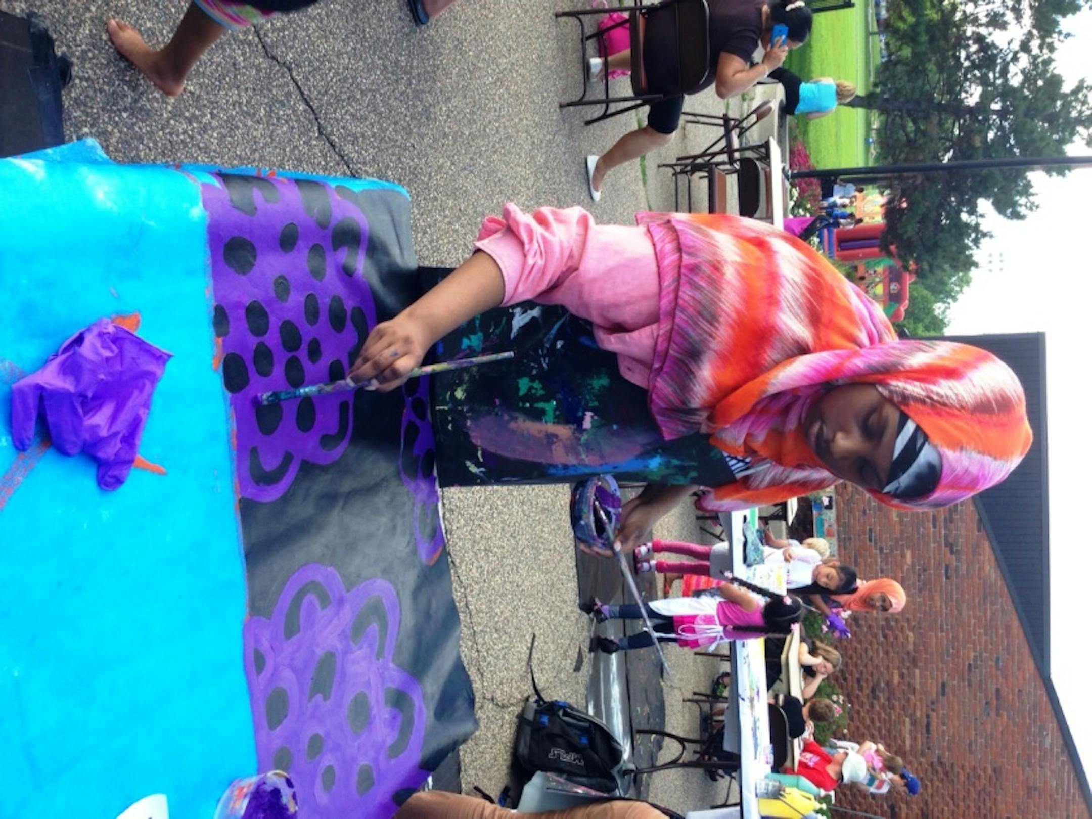 The community project featured hands-on painting of the individual 25-square-foot panels by members of the school community and the larger neighborhood. They applied number-coded artist-quality acrylic colors to a synthetic fabric similar to that used in short collars and cuffs.