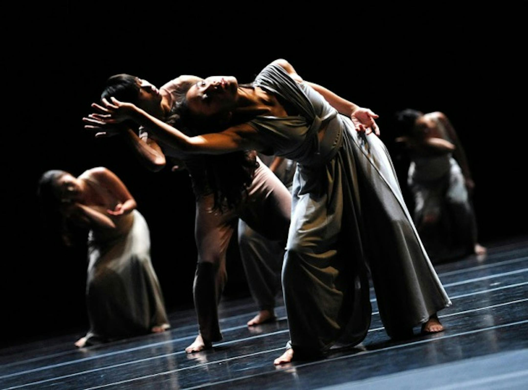 This ritual-like work is built around the massing of groups of people engaged in repetitive movement and idiosyncratic breaks. As the performers enter the auditorium walking backwards they move with a sense of gravitas, slowly and purposefully, determined to maintain a respectful order. Their neutral-colored costumes and spare environment suggest a stark futuristic society, one in which emotions are stripped down and repurposed.