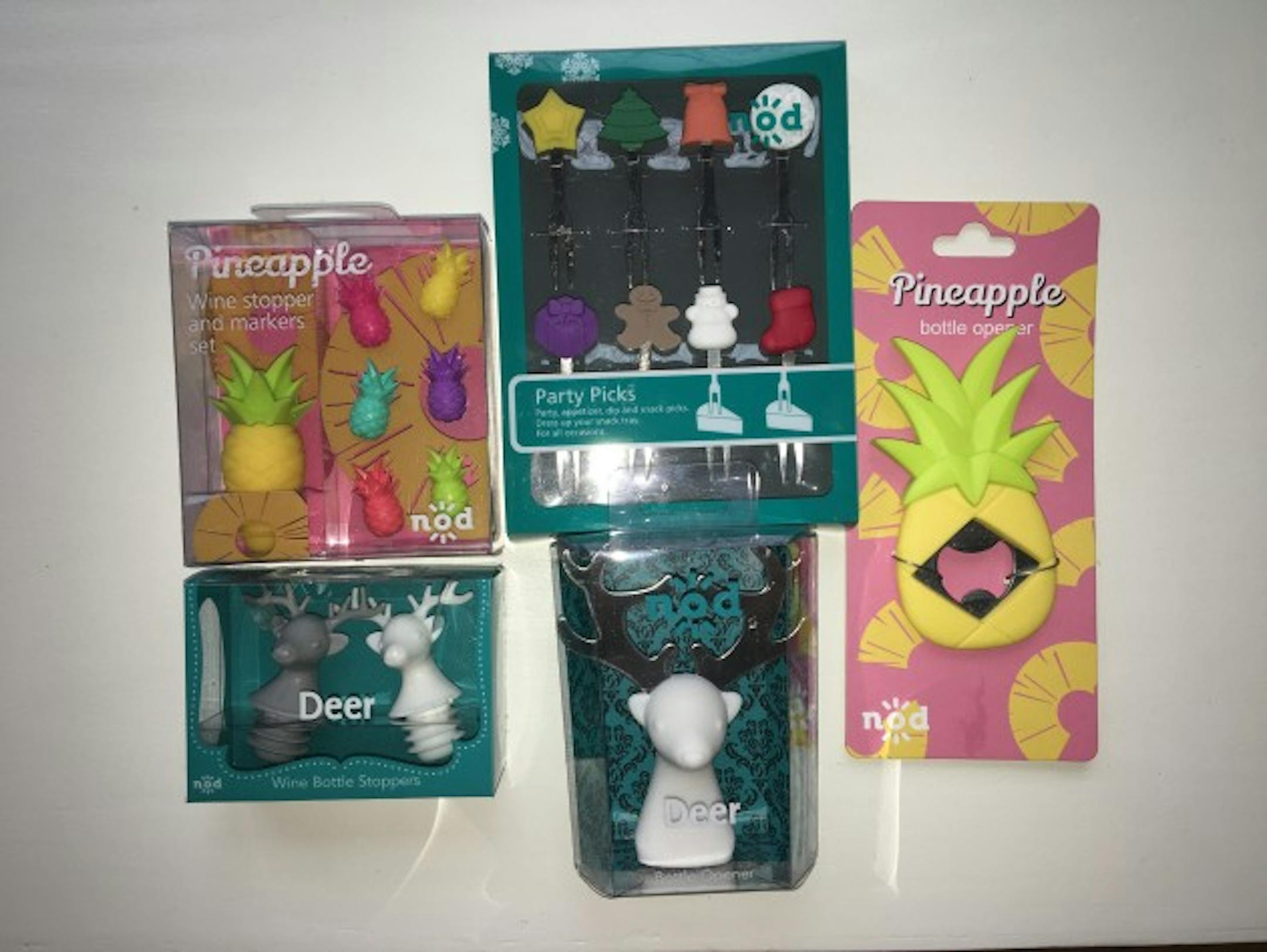 Host or hostess gifts get a dose of party kitsch with cactus, flamingo, sea shell and pineapple-themed glass markers, wine bottle stoppers, party picks, ice trays, and bottle openers,