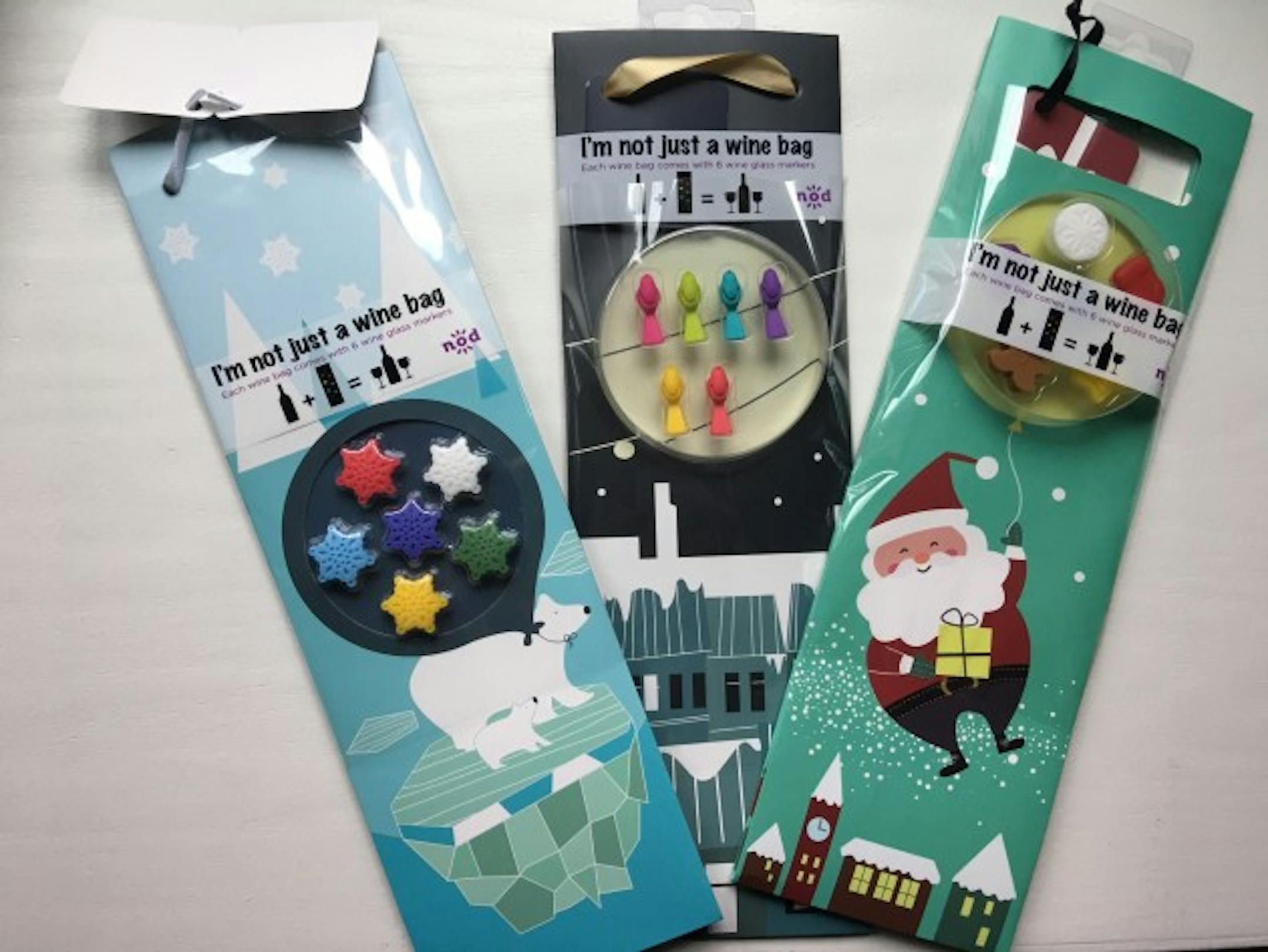 The company's best sellers include wine bags ($5-$7) that include a set of wine glass markers. The notched markers also fit on the rim of a pilsner glass or a Solo cup. Other best sellers include waterproof playing cards and a deer head bottle opener.