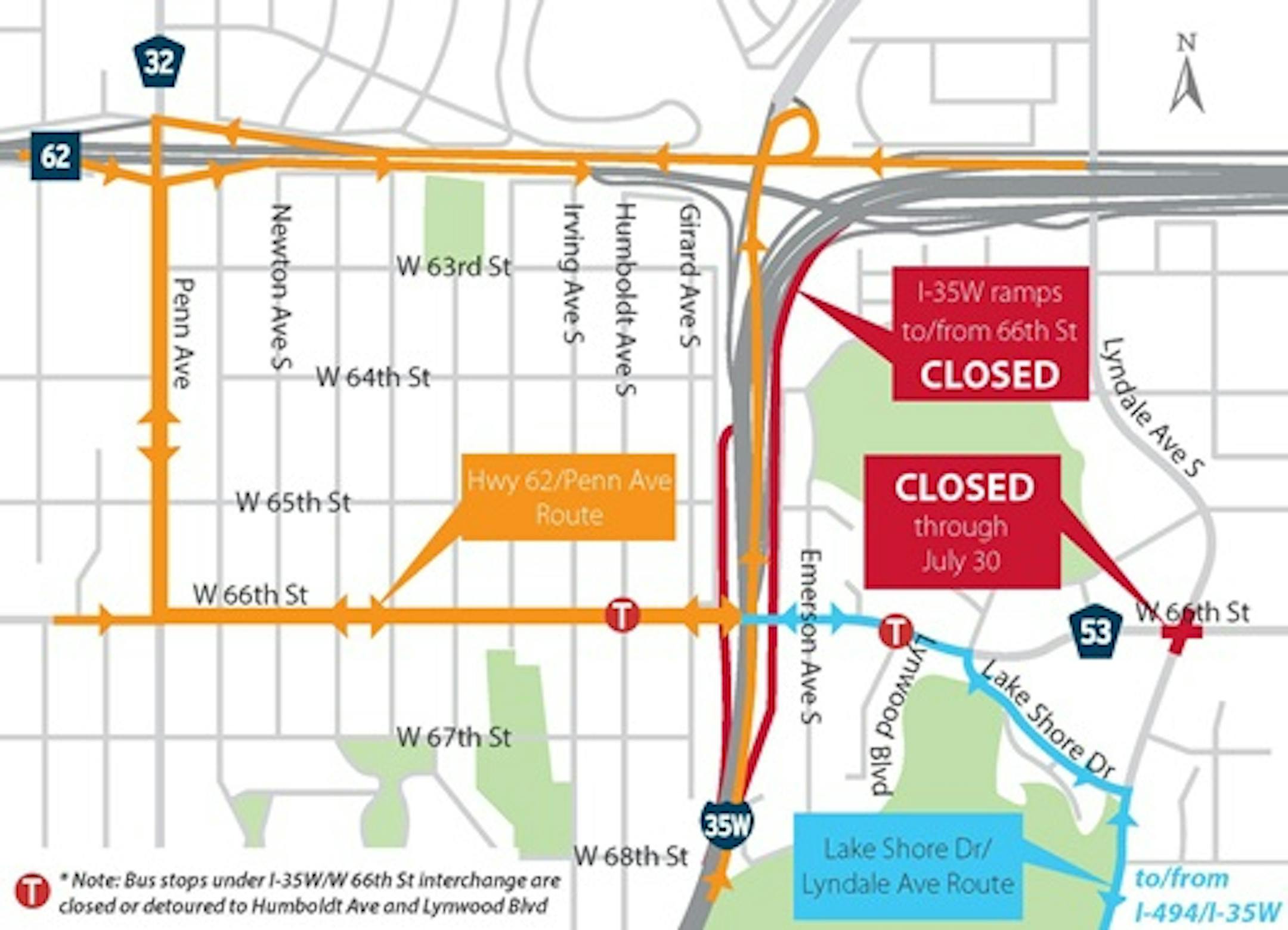 While the ramps are closed, drivers will be directed to use Penn Avenue to the Crosstown and back to I-35W. Another option is to take Lake Shore Drive to Lyndale Avenue down to the I-494/35W interchange.