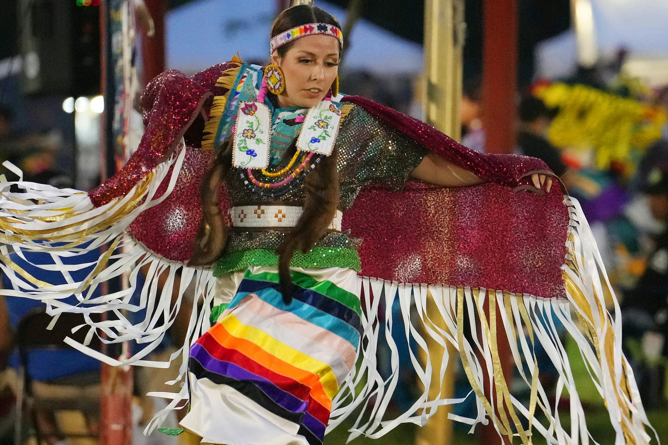 From toddlers to elders, dancers wore dresses with clinking, cone-shaped jingles, colorful ribbons, fringed pants and feathered bustles as they entered a circular arena surrounded by bleachers, drum groups and the rich scents of tobacco and fry bread.