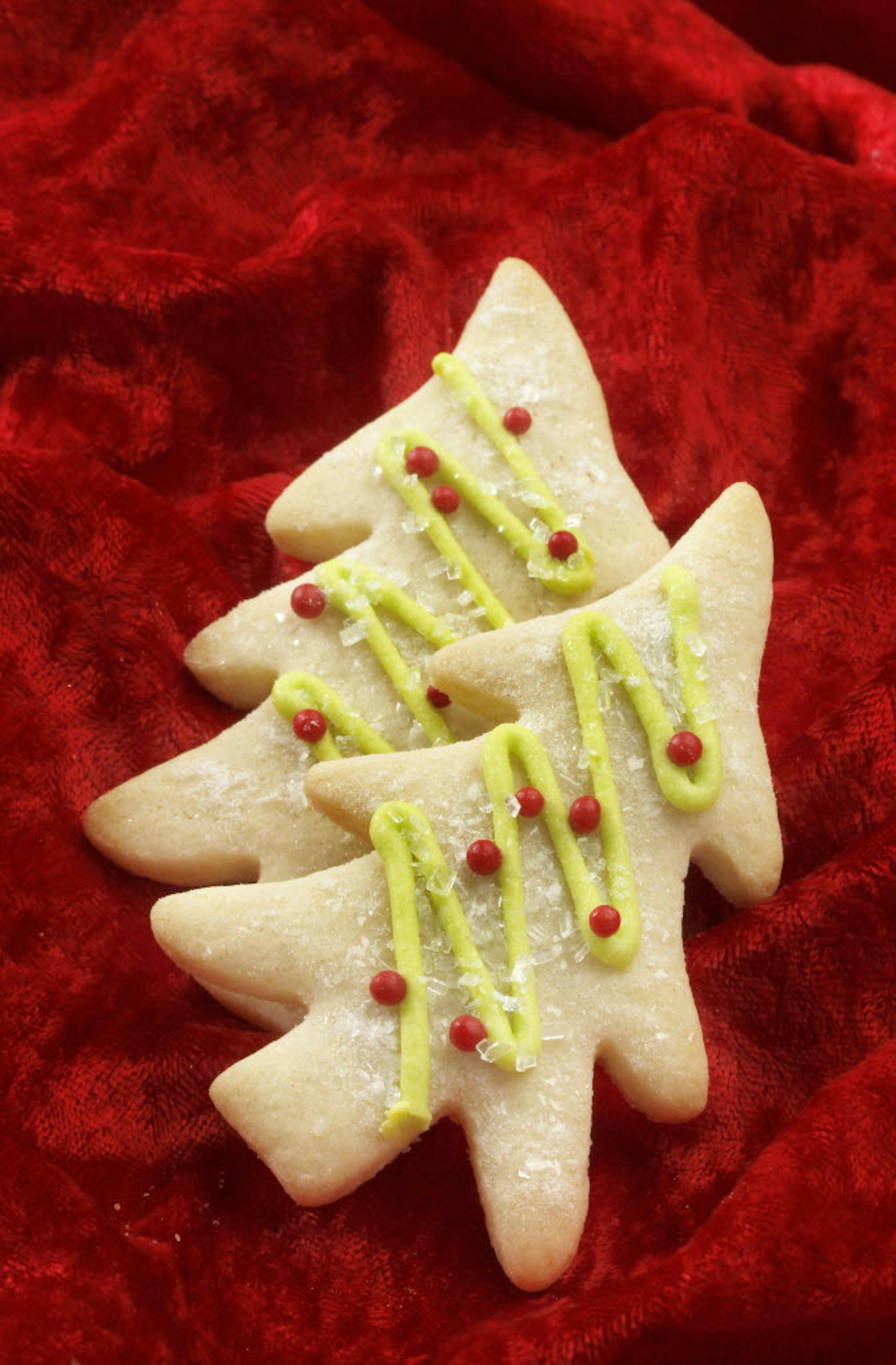 On a lightly floured surface, using a lightly floured rolling pin, roll out dough to 1/4-inch thickness. Using a tree cookie cutter, cut out dough and place 2 inches apart on prepared baking sheets.