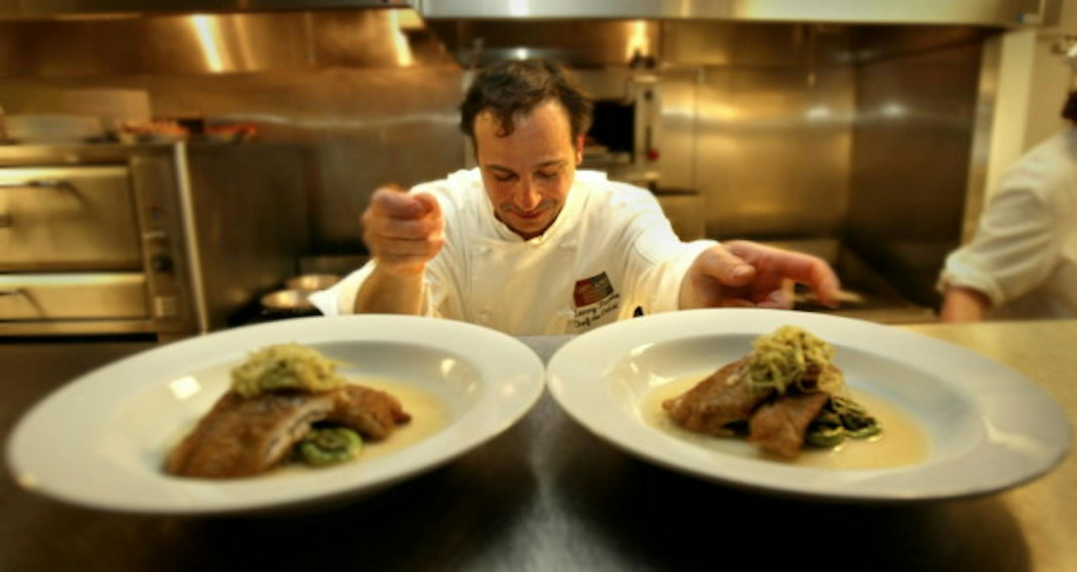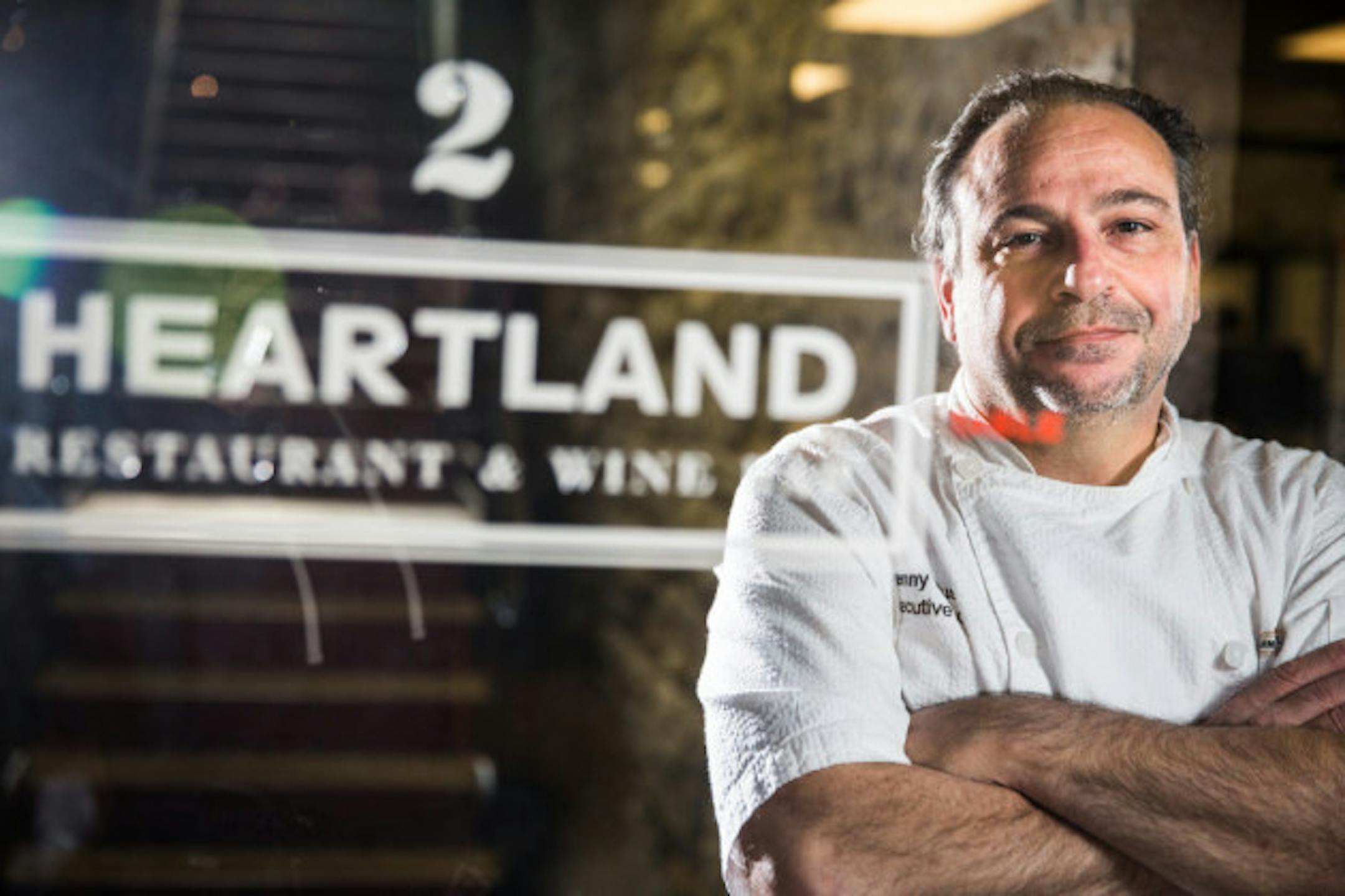 2002: Heartland, St. Paul. "Is Midwestern haute cuisine an oxymoron?" asked critic Jeremy Iggers. "Not according to Lenny Russo. Heartland, Russo's stylish new 'contemporary Midwestern' St. Paul cafe, boldly takes diners where few chefs have ventured before: our own back yard. The Hoboken, N.J., native, previously the executive chef at W.A. Frost & Co., offers a Midwestern haute cuisine that features dishes such as Minnesota wild boar chop with maple-glazed baby root vegetables and preserved blueberry sauce, and pan-roasted Wisconsin rabbit with yellow foot chanterelle mushrooms and blackberry glace de viande. Not exactly the kind of cooking most Midwesterners grew up with. Russo is fanatic about ingredients; his meat and poultry all come from small local producers, as does much of his produce."