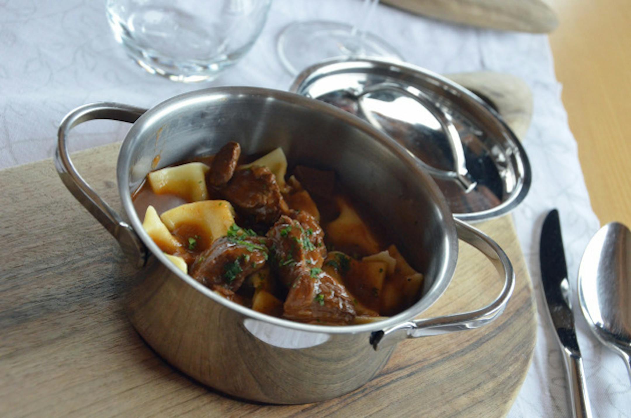 - There was a minipot of lamb goulash with tortellini-like potato-stuffed pasta.