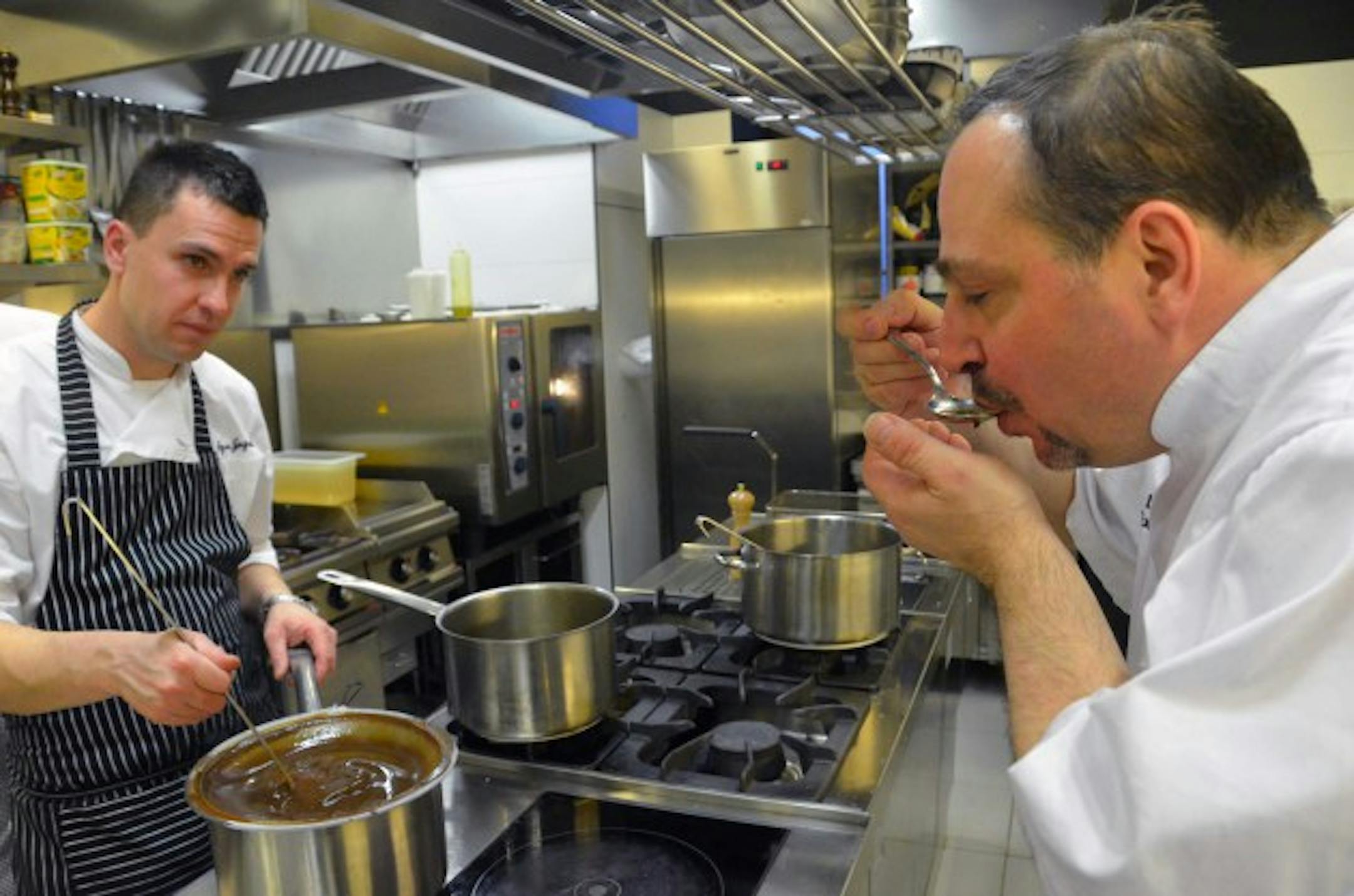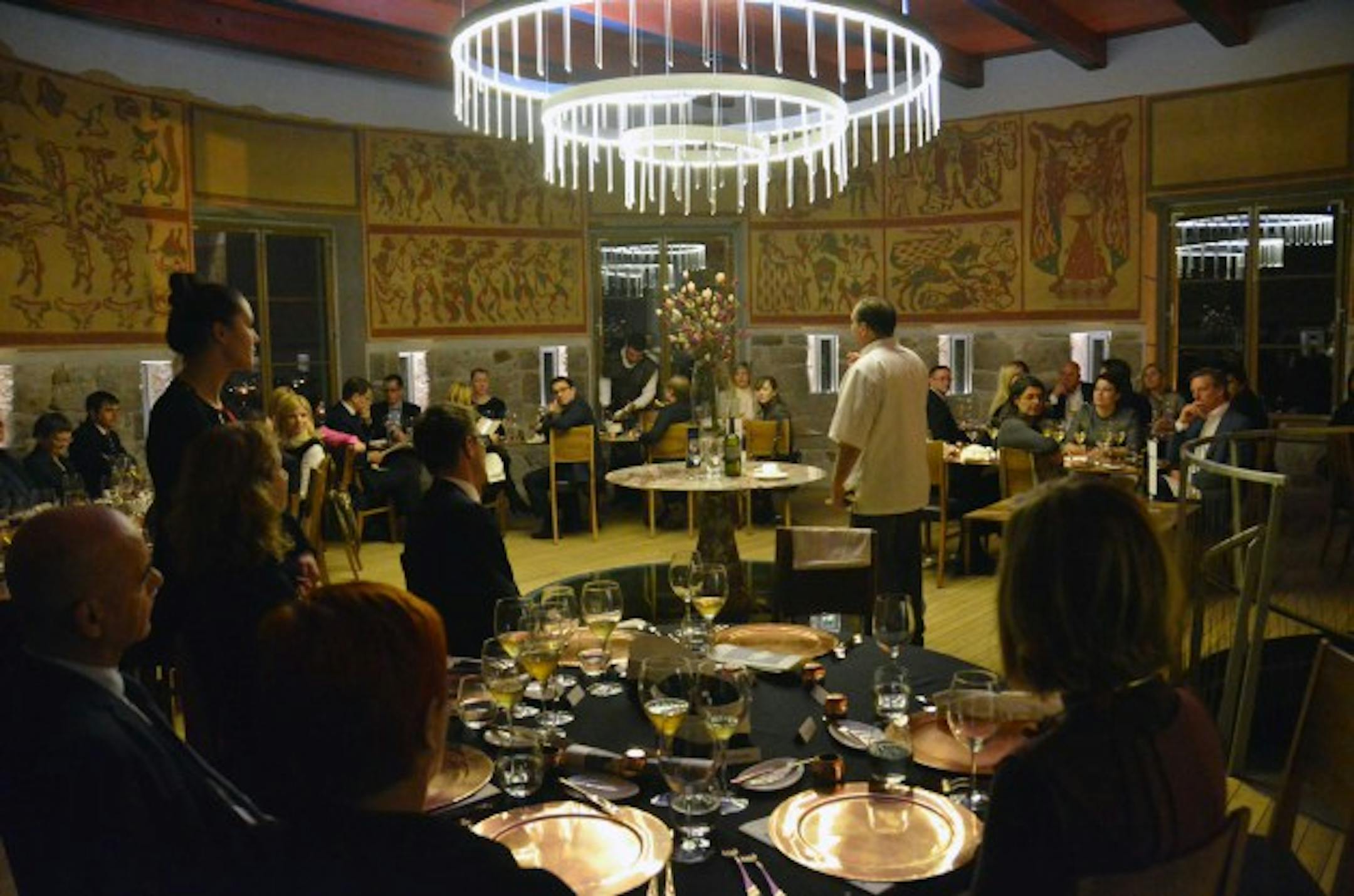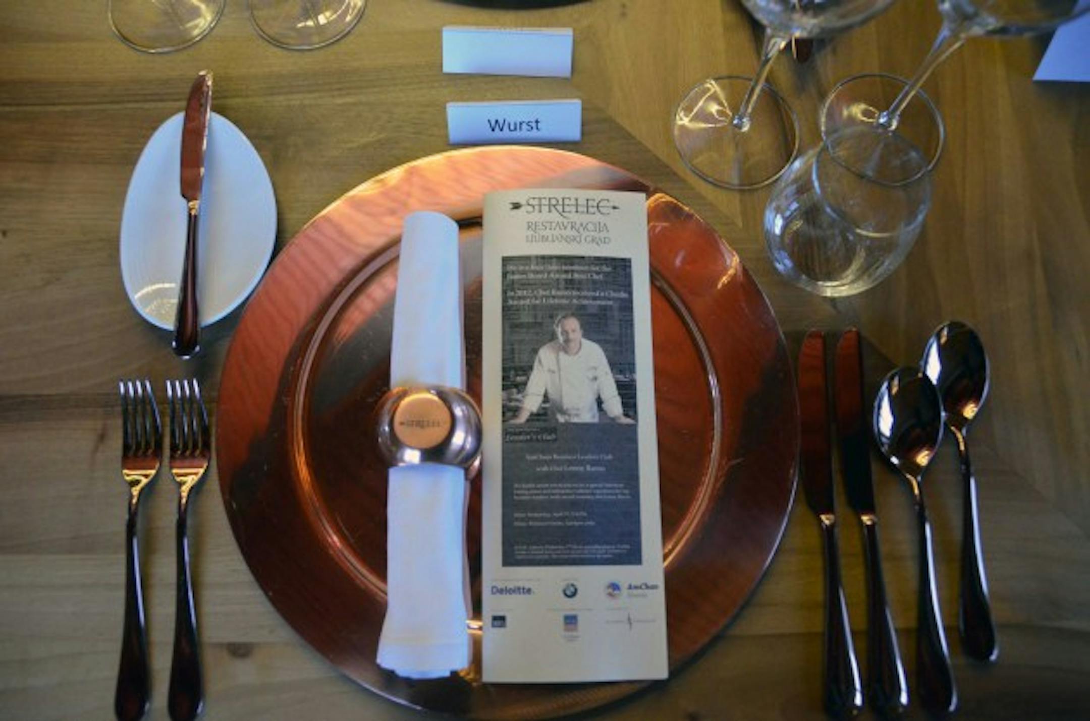 What do you serve in a castle? Perched above Slovenia's capitol city of Ljubljana in the castle of the same name, Lenny Russo (below, right) and chef Igor Jagodic (below, left) prepared a collaborative dinner at Strelec Restaurant, with wines from Movia Winery, for the enjoyment of guests of the U.S. Embassy and local chefs, restaurateurs and business people.