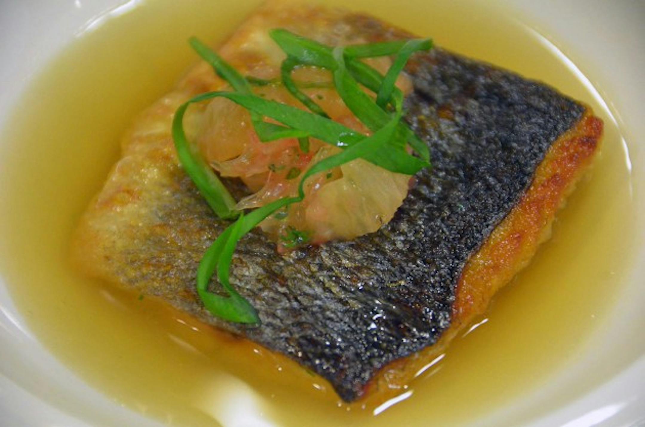 Fonda sea bass fillet Grapefruit and wild garlicFish fumetLunar 9 Chardonnay Movia