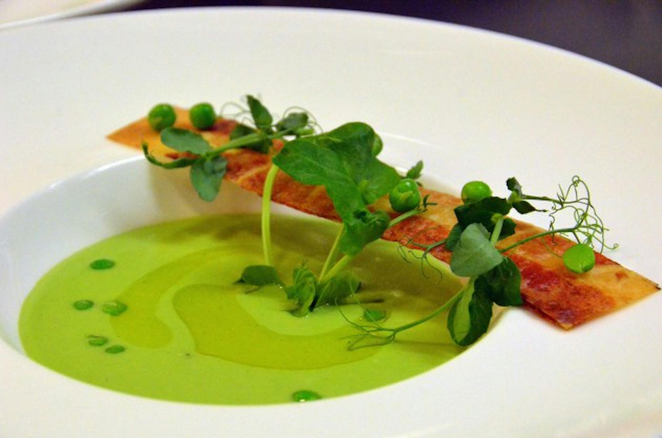 Cold pea soup with mintPea sprouts, peasKarst prosciutto crackerLunar 8 Rebula Movia