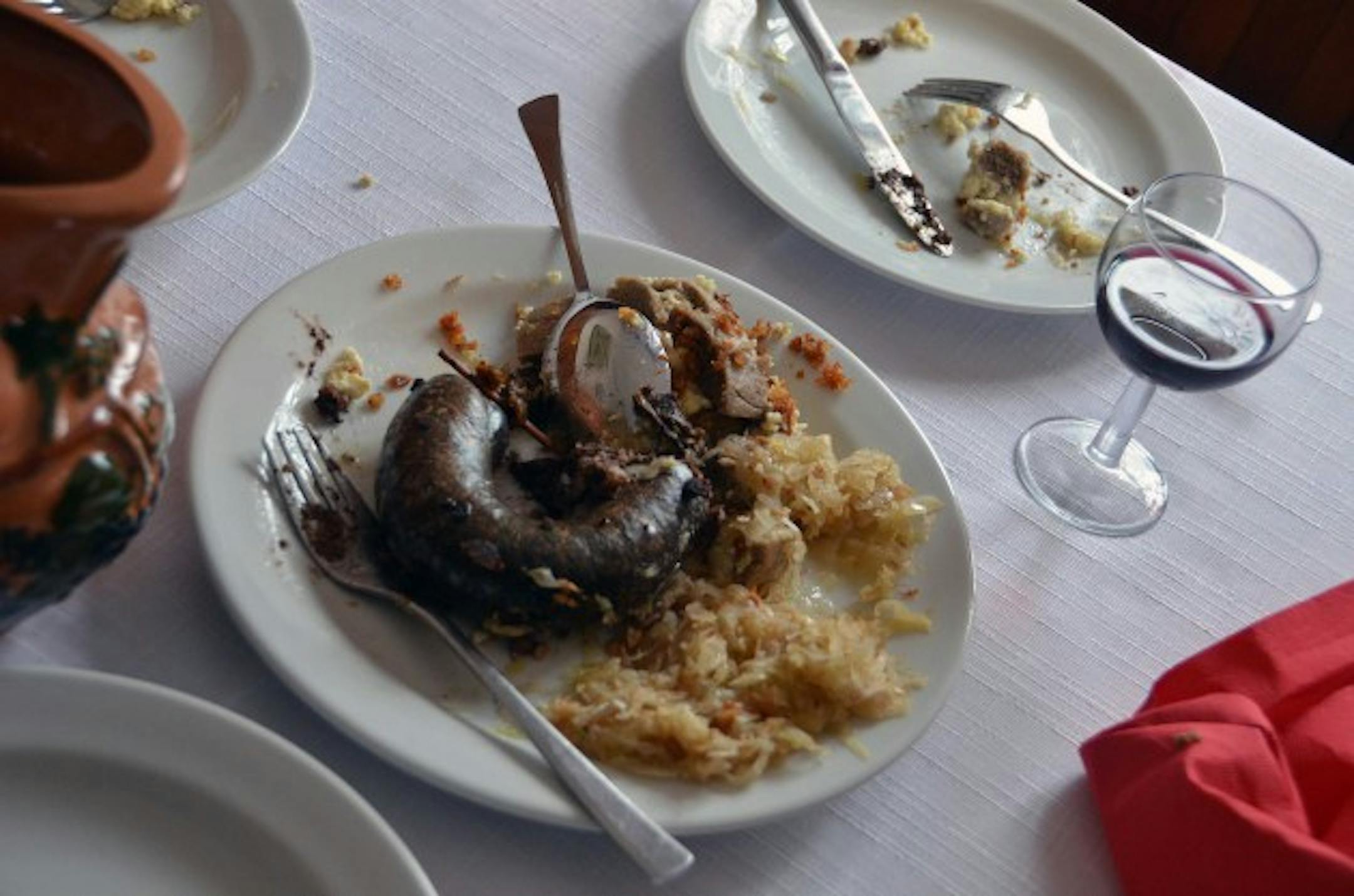 Next we drove high into the lower Julian Alps. I have been driving a brand new little red Fiat 500, which proved remarkably up to the task given condition of the roads once we lost pavement and replaced it with ice, snow and ruts. We stopped in Radovna at Gostilna Psnak where I toured the farm and dined on blood sausage with sauerkraut and quark krape. Krape are made form buckwheat sometimes mixed with ground Tepka pear flour. These were 100 percent buckwheat and stuffed with the farm's own quark.