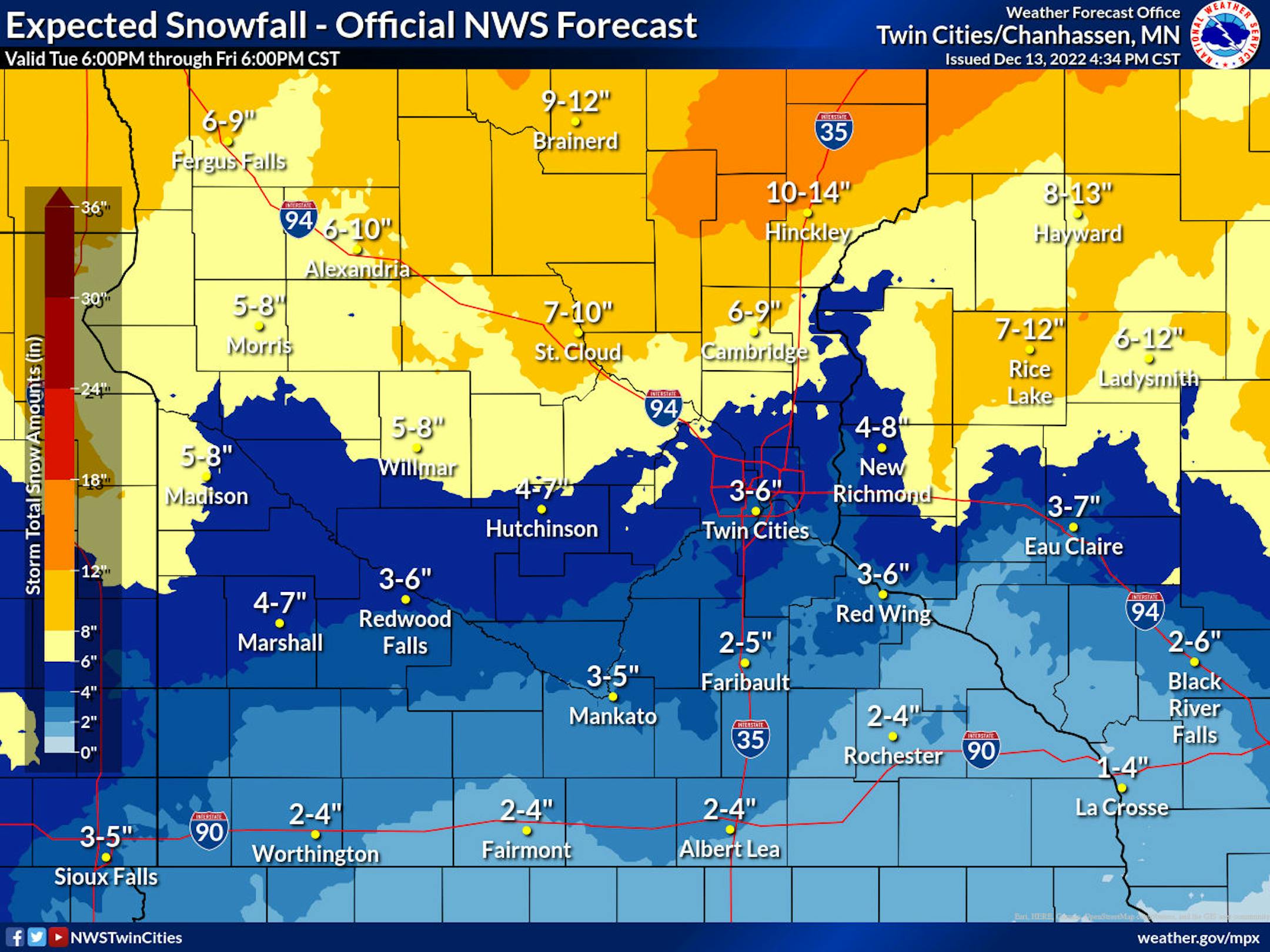Areas of heavy snow will continue from late Tuesday night through the end of the week with the heaviest snow staying north of the metro. Some double digits tallies will be possible north and east of St. Cloud, closer to the head of Lake Superior.