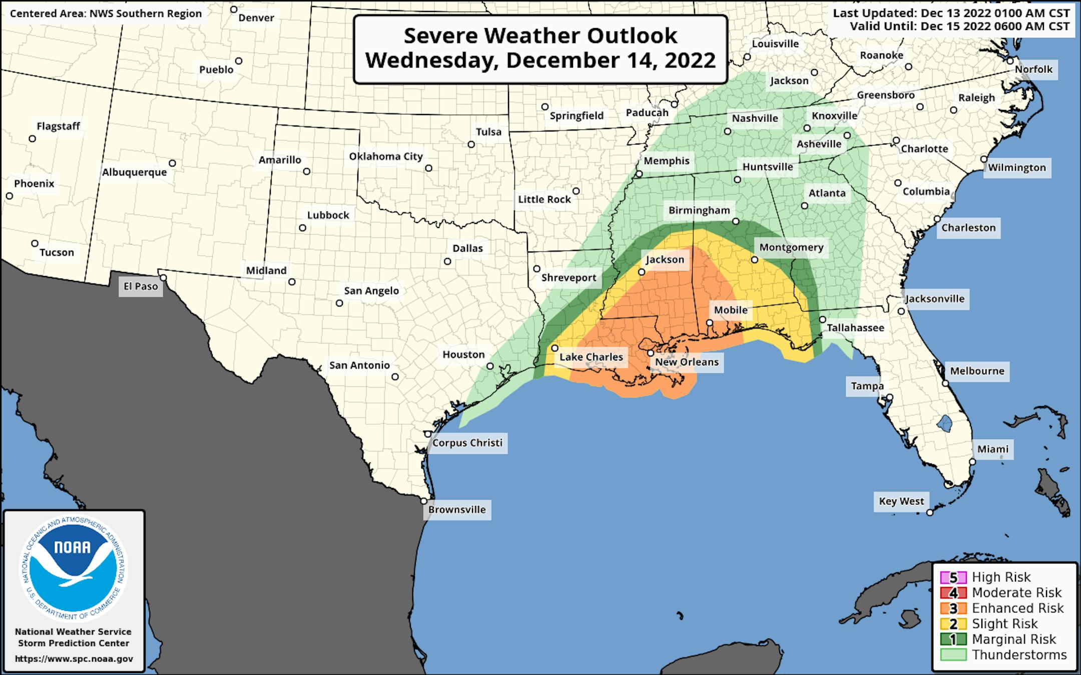According to NOAA's SPC, there is an ENHANCED RISK of strong to severe thunderstorms, where large hail, damaging winds and even a few strong tornadoes will be possible on Tuesday. The severe threat continues on Wednesday across the Gulf Coast States.